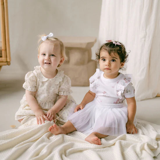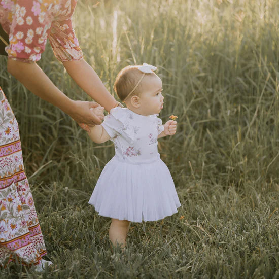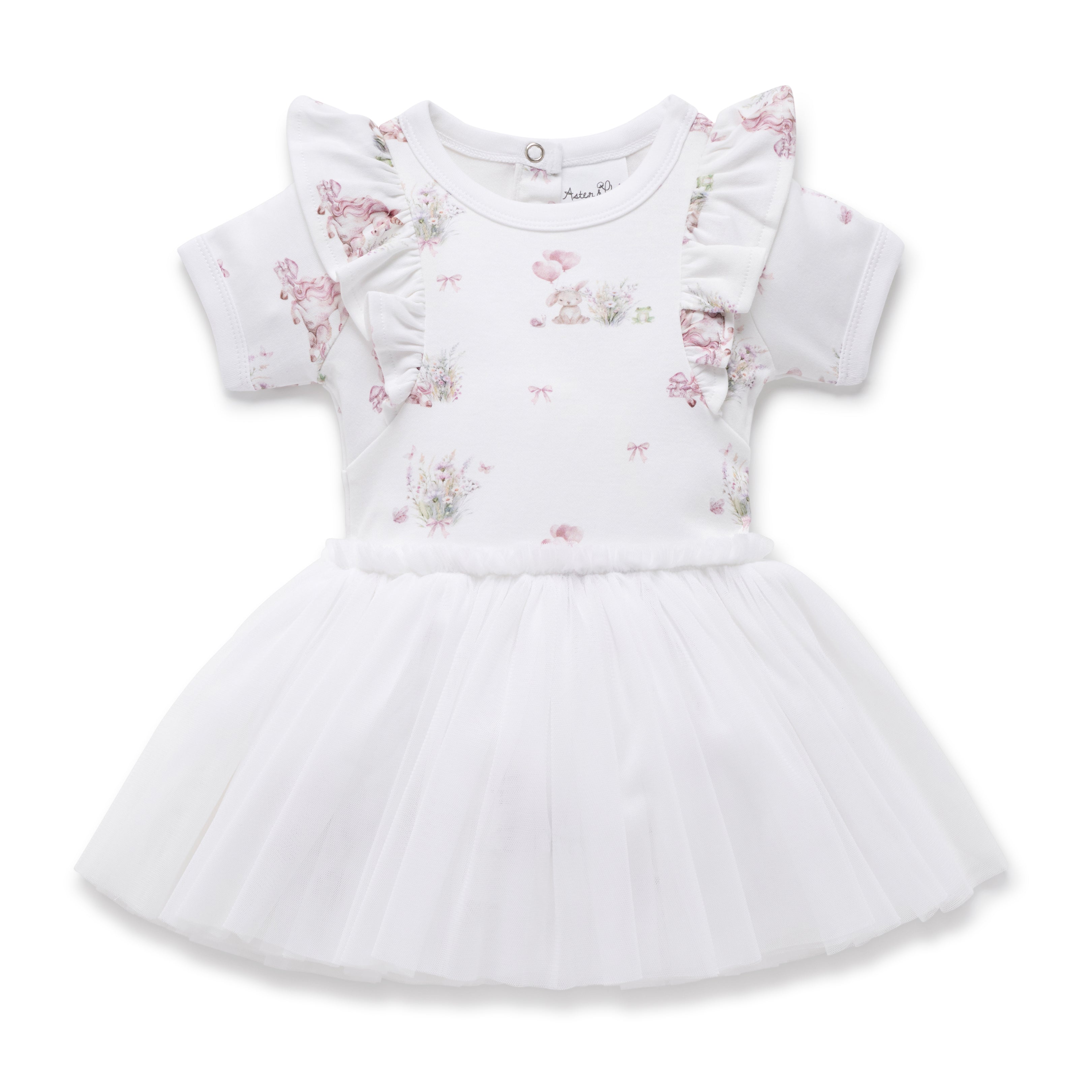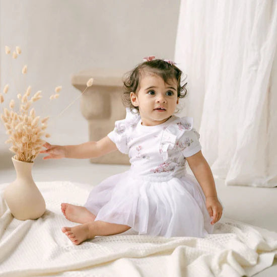 Made with GOTS certified organic cotton, this tutu dress features a full flare skirt with layers of tulle, water colour unicorn print over a white base and ruffle detail to sleeves. 95% Certified organic cotton 5% Tulle #USB008294. Made in India. Wash according to care instructions.