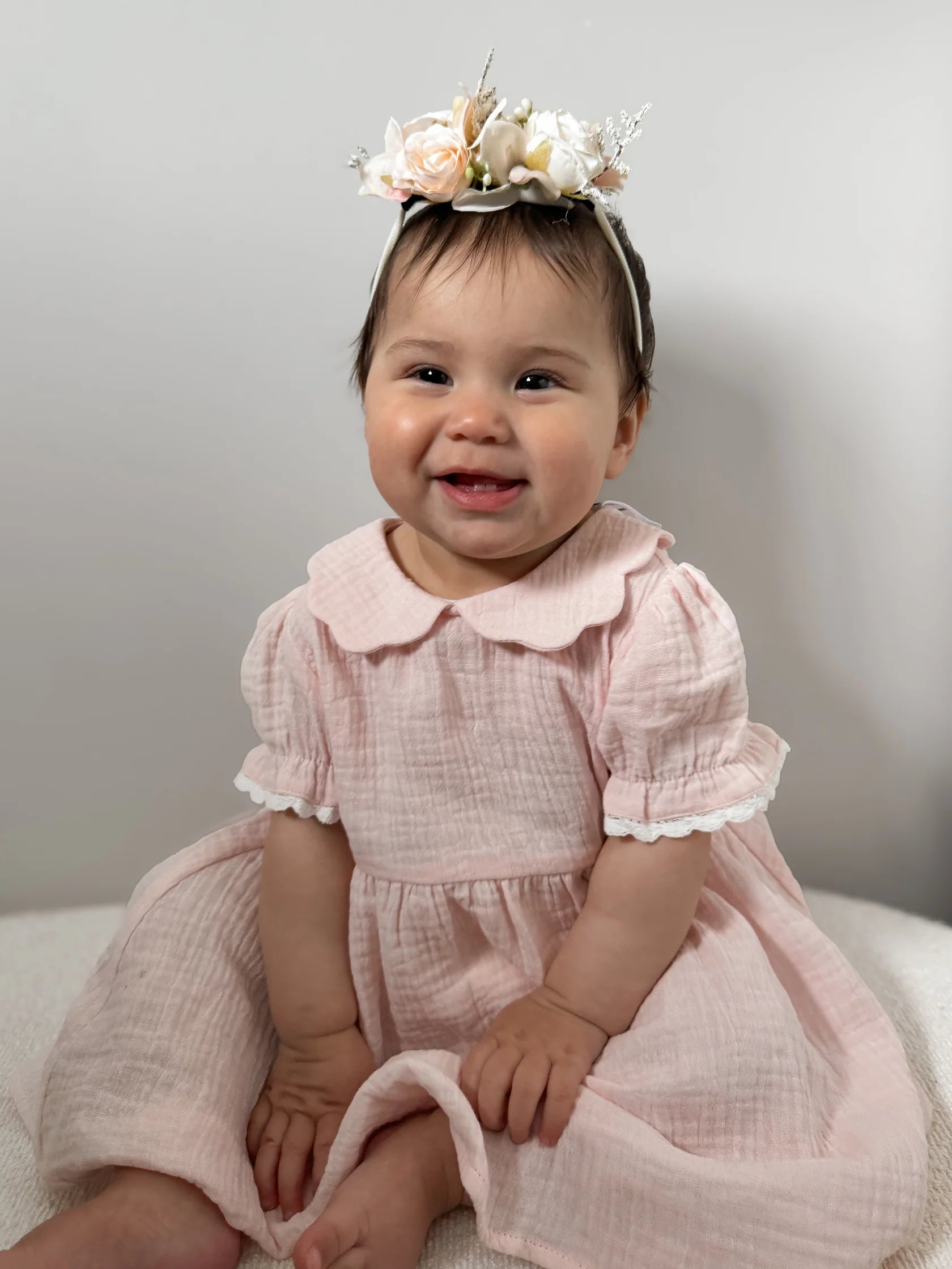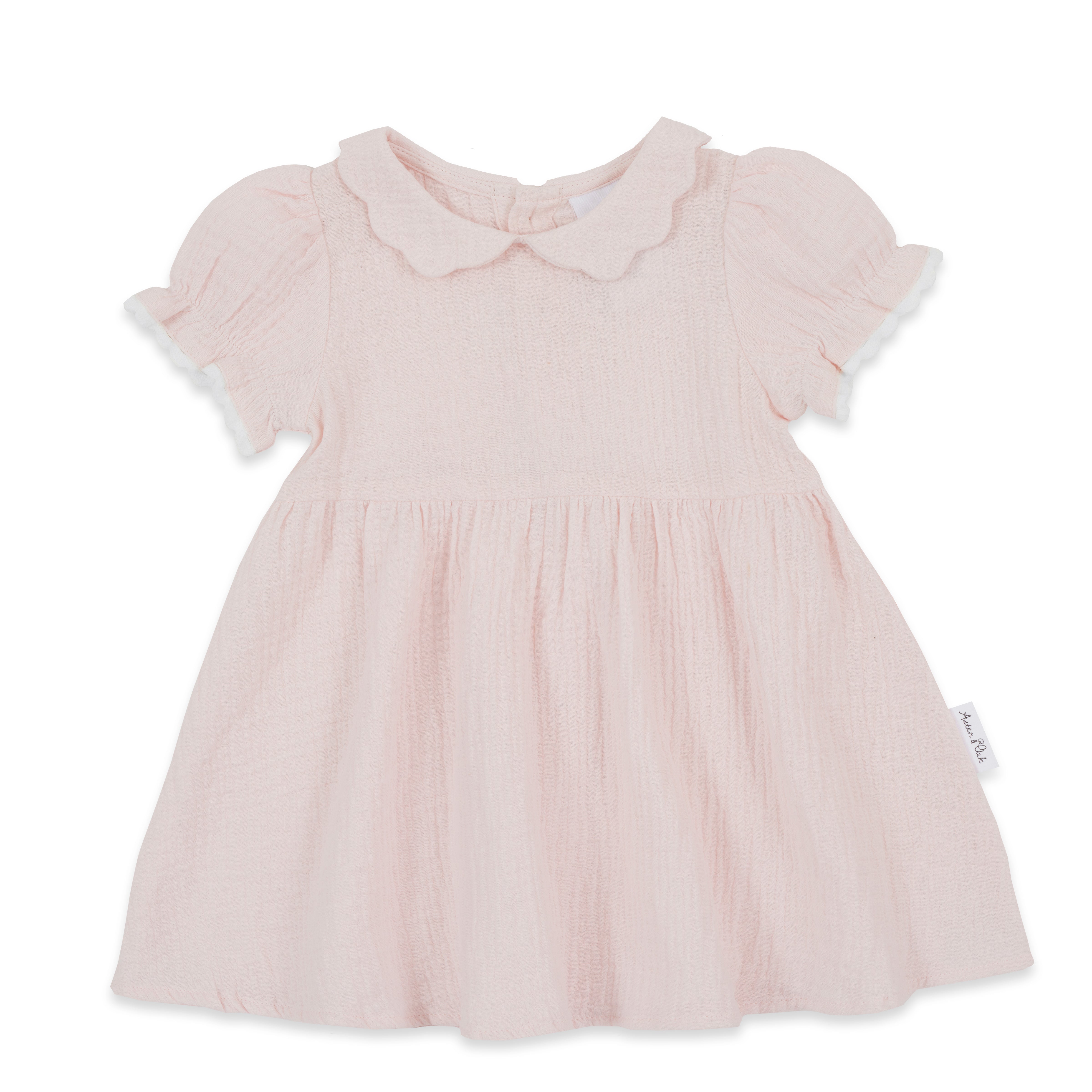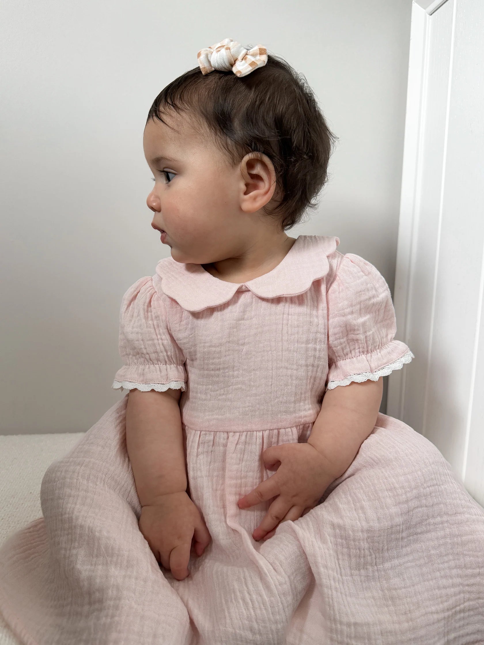 The Pale Pink Muslin Trim Dress is a sweet and timeless design, perfect for creating cherished memories. Crafted from all natural soft, breathable muslin in a delicate blush pink, it features a charming scalloped-edge collar, gathered ruffle puff sleeves, and a gently flared skirt for a classic silhouette. Buttons down the back add style and make for easy dressing, while the lightweight fabric ensures comfort on warm, sunny days. A beautiful choice for special occasions or everyday elegance.