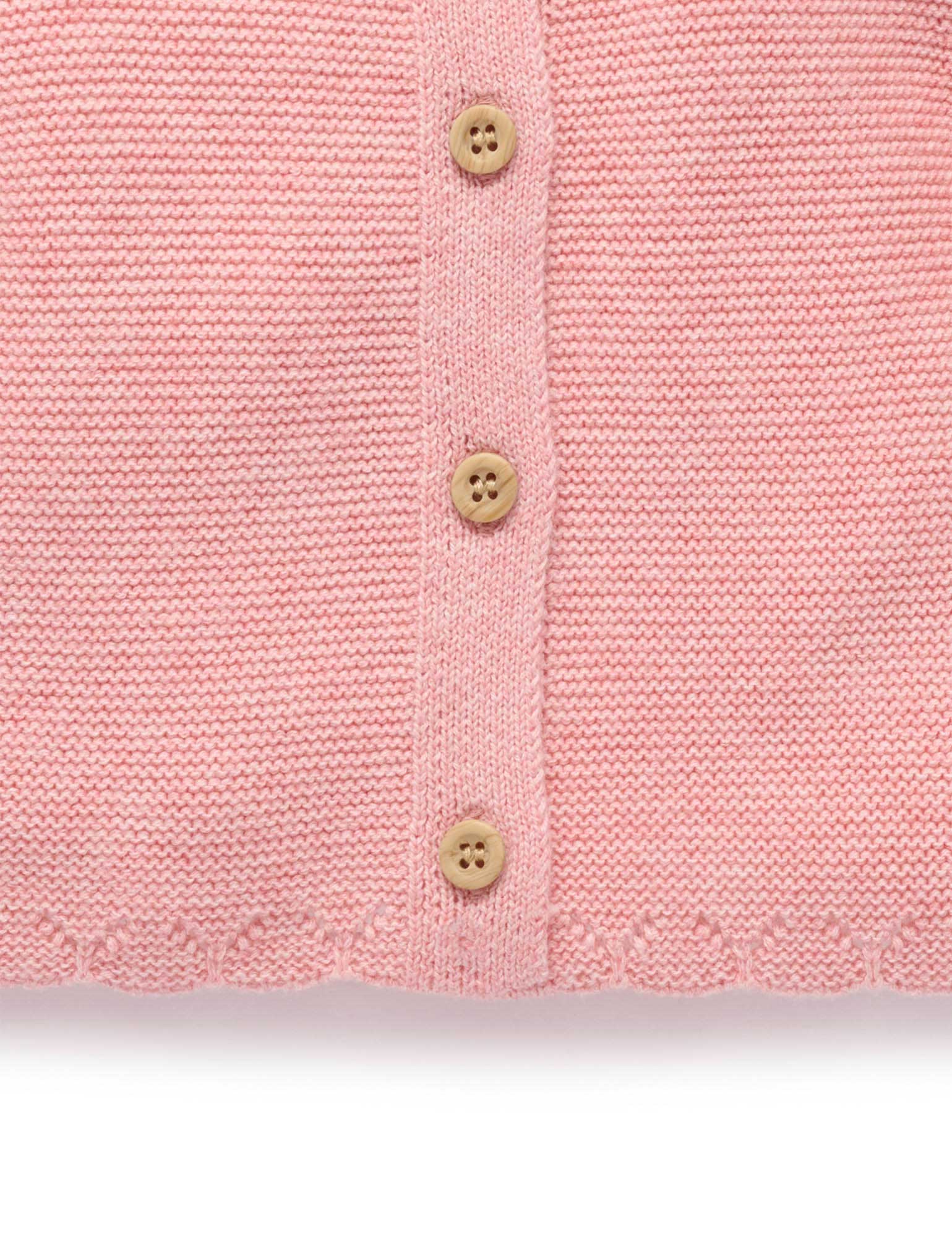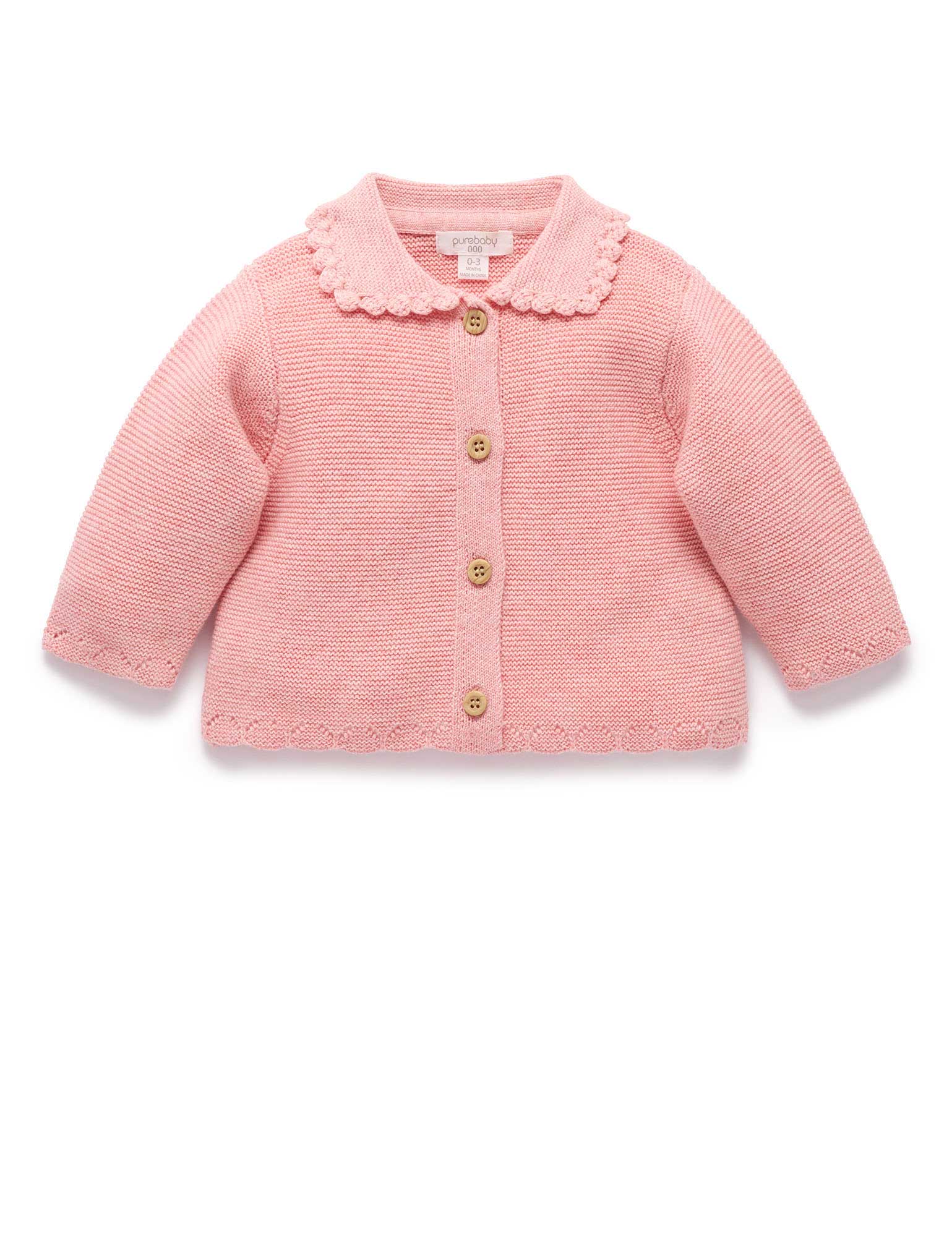 Our Crochet Collar Cardigan is the perfect style to layer over their winter outfits. Lovely and soft, designed with sweet, scalloped crochet collar detail. Made from our cosy organic cotton and wool blend yarn. Layer over our dresses and bodysuits for a pretty outfit. Crochet collar detail Wood look buttons at the chest. Perfect for layering. Made from 92% Organic Cotton/8% Wool