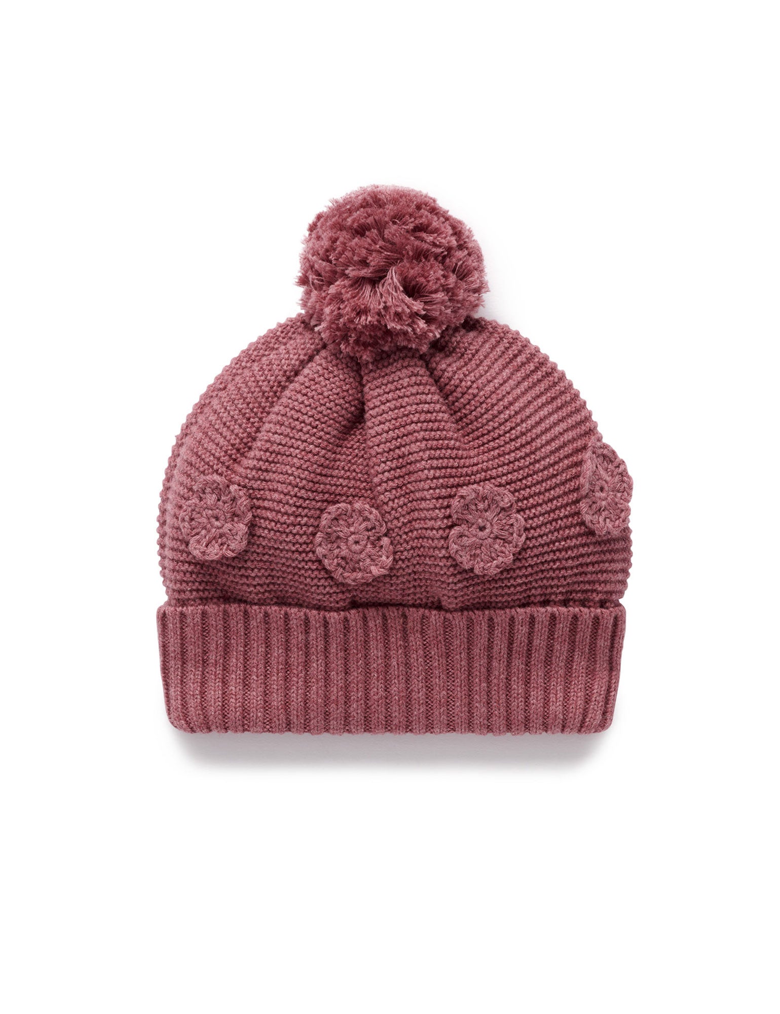 Our Crochet Flower Beanie, knitted in a thick stitch, is a warm and cosy winter piece. Featuring a fun pom pom detail and sweet 3D crochet flowers, it is the perfect accessory to complete any outfit. Made in soft organic cotton yarn with a touch of wool, this is a comfortable hat that won't itch. 3D crochet flower details Rib turn back for comfort Pom pom on the crown Made in 92% Organic Cotton/8% Wool Pom Pom tested according to AS/ISO 8124.1 70N This item is available in both baby & kids sizing. Perfect for matching with siblings, cousins and friends, or purchase multiple sizes for wear in future years.