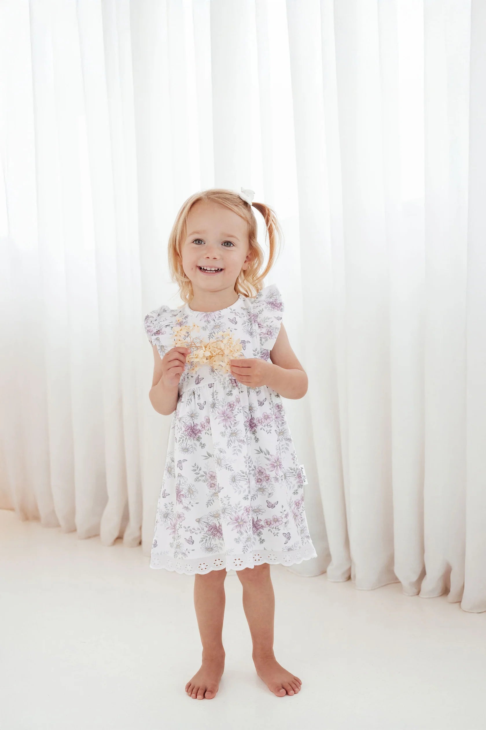 Thoughtfully designed with gorgeous ruffles to front, lace hem and full flared skirt, this dreamy dress will have your little one twirling into play time or that special occasion. Pair with our tights on cooler days or accessorize with our matching headband, either way this dress is sure to be a gorgeous favourite all year round.