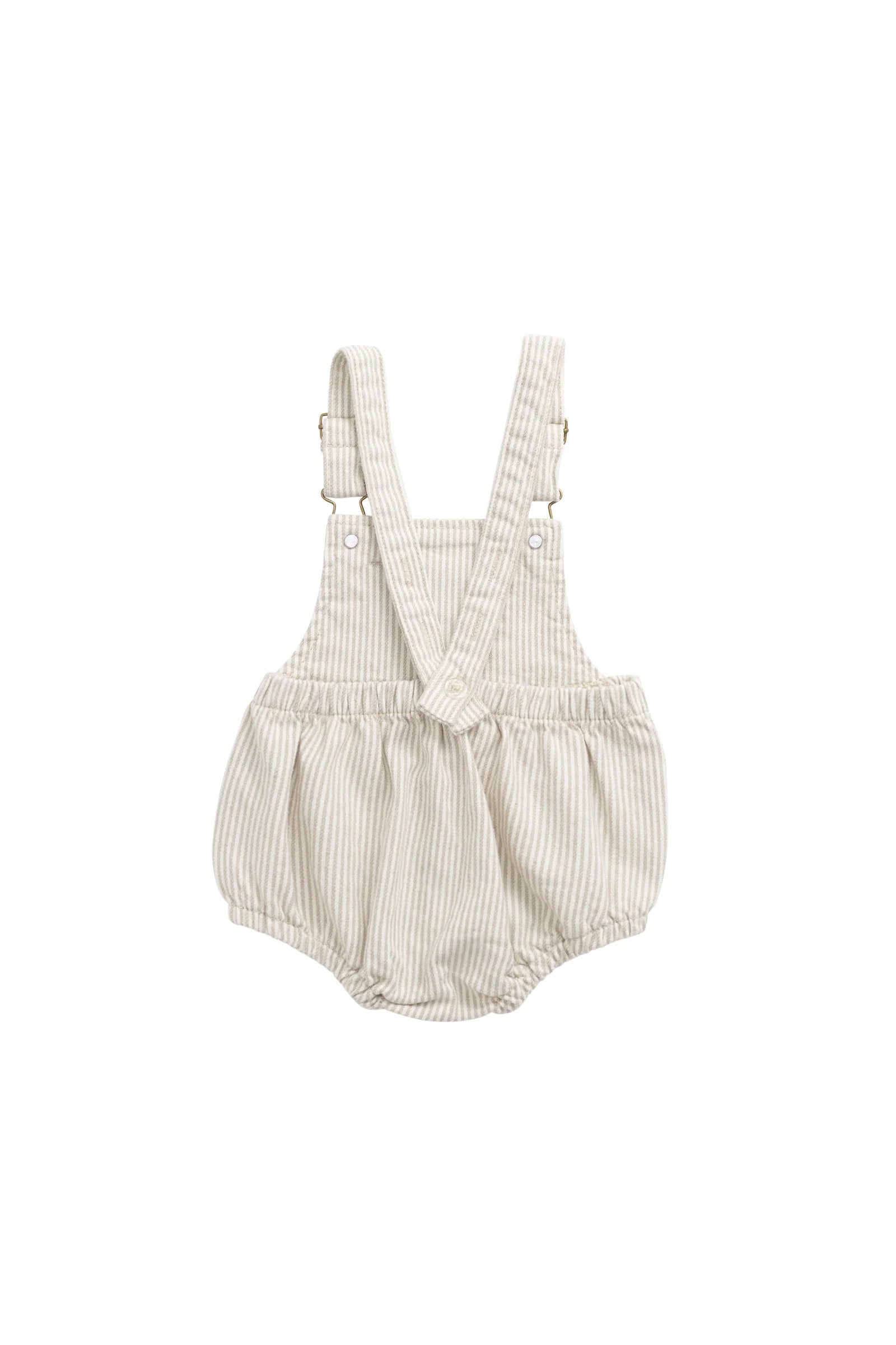 The Pax Playsuit – Fine Vertical Stripe Sandy Brown/Cloud is a timeless piece designed for comfort and style. Featuring soft vertical stripes in sandy brown and cloud tones, this playsuit includes adjustable suspender-style straps with metal buckles, an elasticated waist and leg openings, and a sweet chest patch detail for added charm.