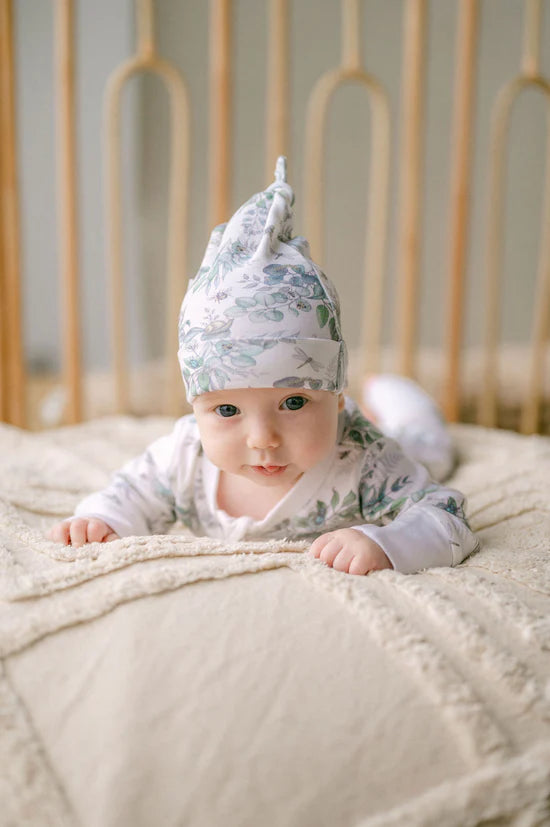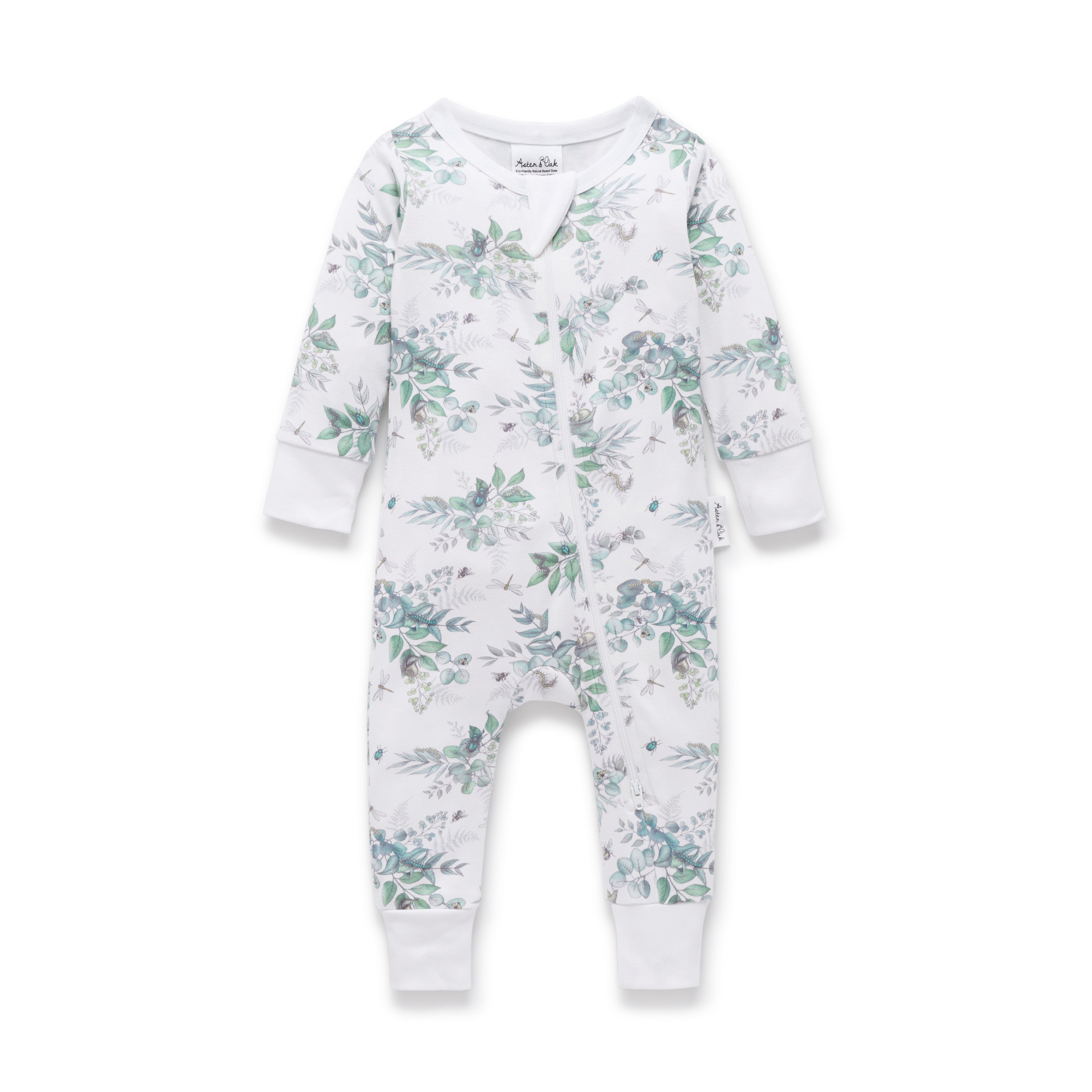 Made from GOTS certified organic cotton, theSnuggle Bug Zip Romper has long sleeves, features a neutral green hue print of foliage with bugs and premium YKK two way zippers with protective backing/zip cover. NOTE sizes NB and 0-3m come with fold over hand and feet cuffs.
