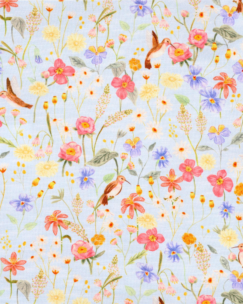 Let her flit and flutter through the day in this charming bodysuit, scattered with blossoms and songbirds. Featuring delicate frill sleeves and gentle gathers, it's perfect for sunny strolls and garden naps. Made from soft, stretchy cotton elastane for all-day comfort and easy movement.