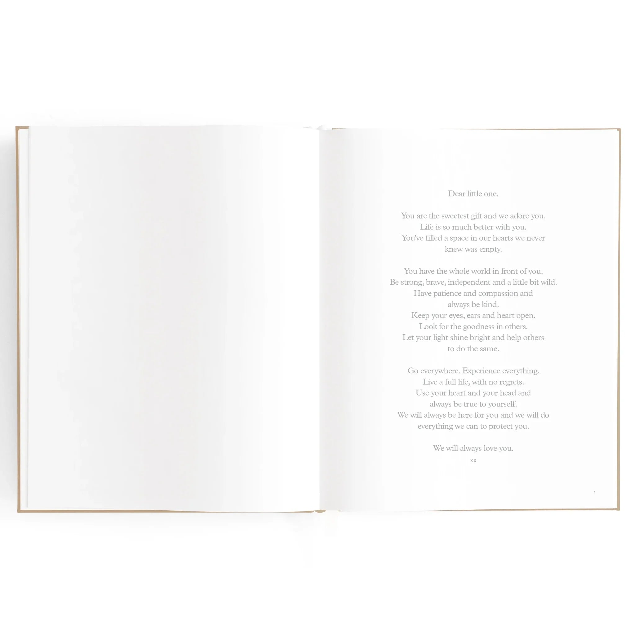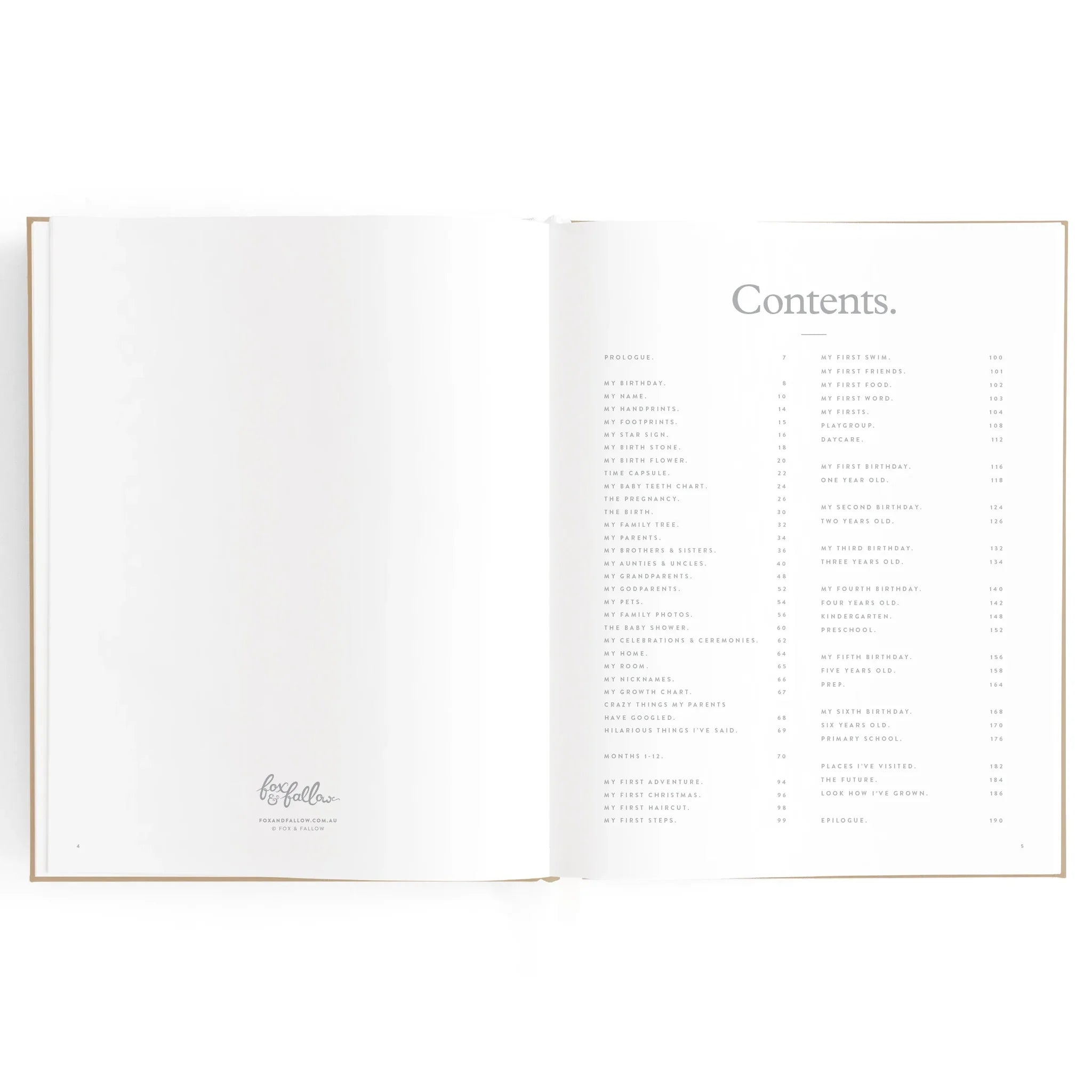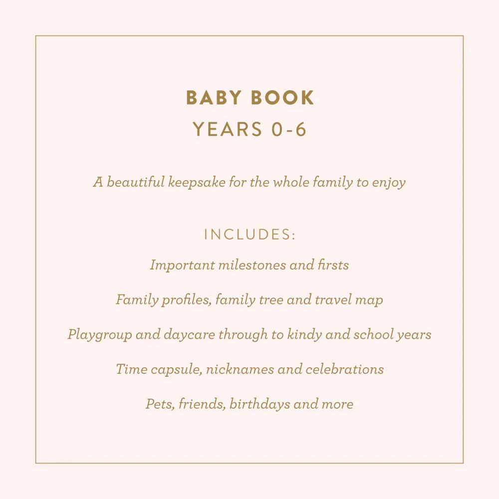 A beautiful keepsake for the whole family to enjoy. Includes: important milestones and firsts, family profiles, family tree and travel map, playgroup and daycare through to kindy and school years, time capsule, nicknames and celebrations, pets, friends, birthdays and more. 190 pages.