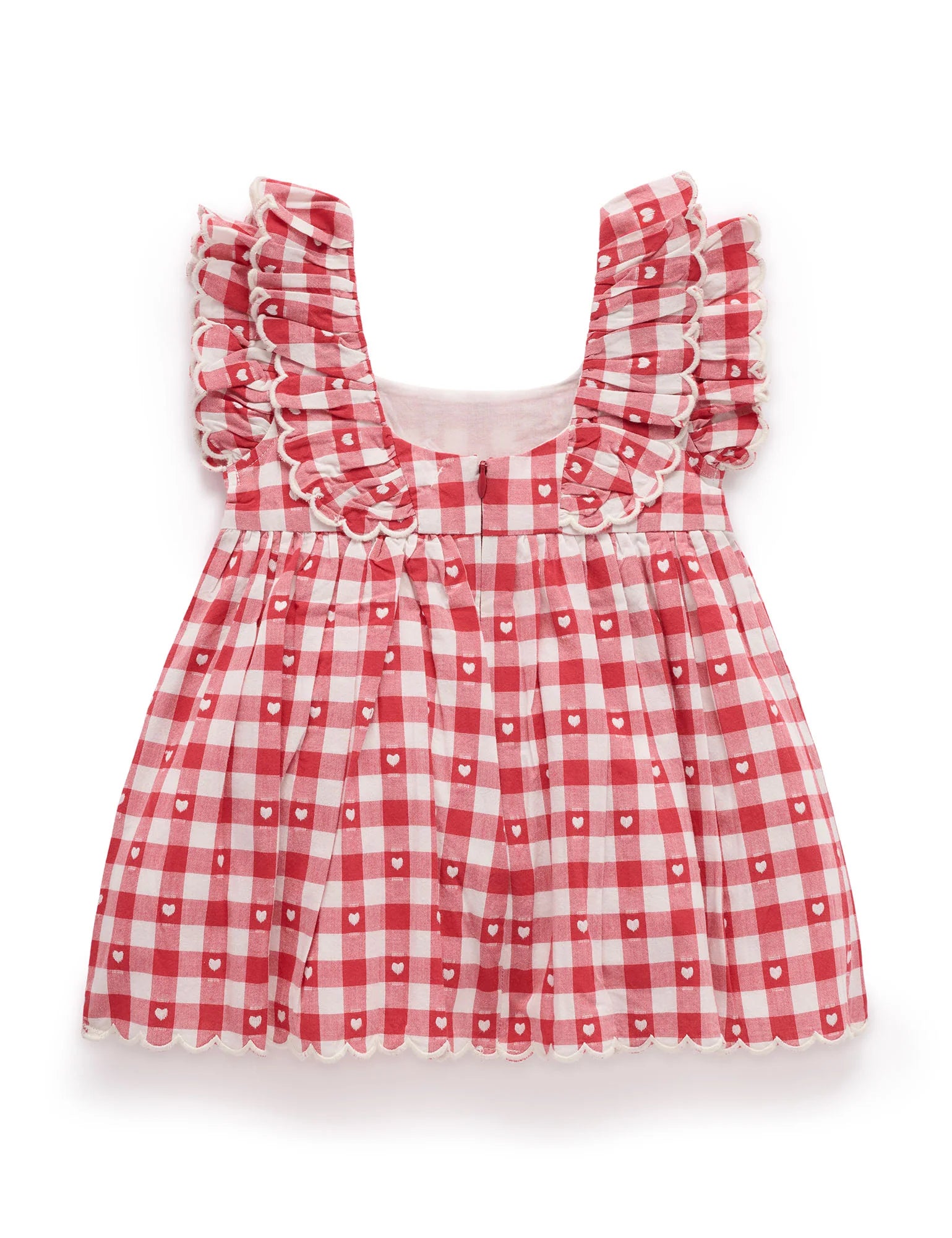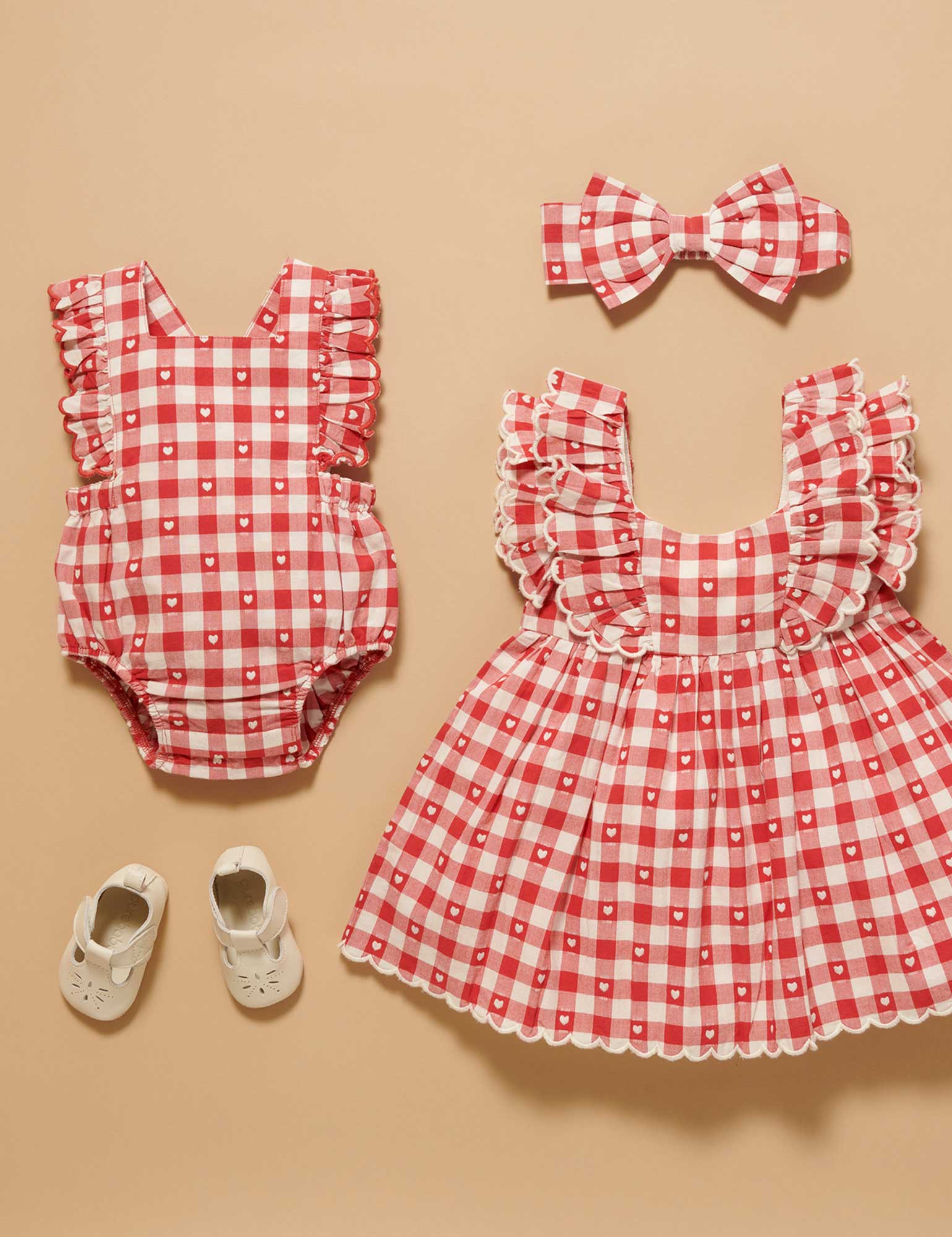 Our Heart Gingham Dress is perfect for those special occasions this festive season! Featuring a classic gingham pattern with little hearts, gathered skirt, and ruffled scalloped details Made from our organic cotton linen blend for a breathable style.