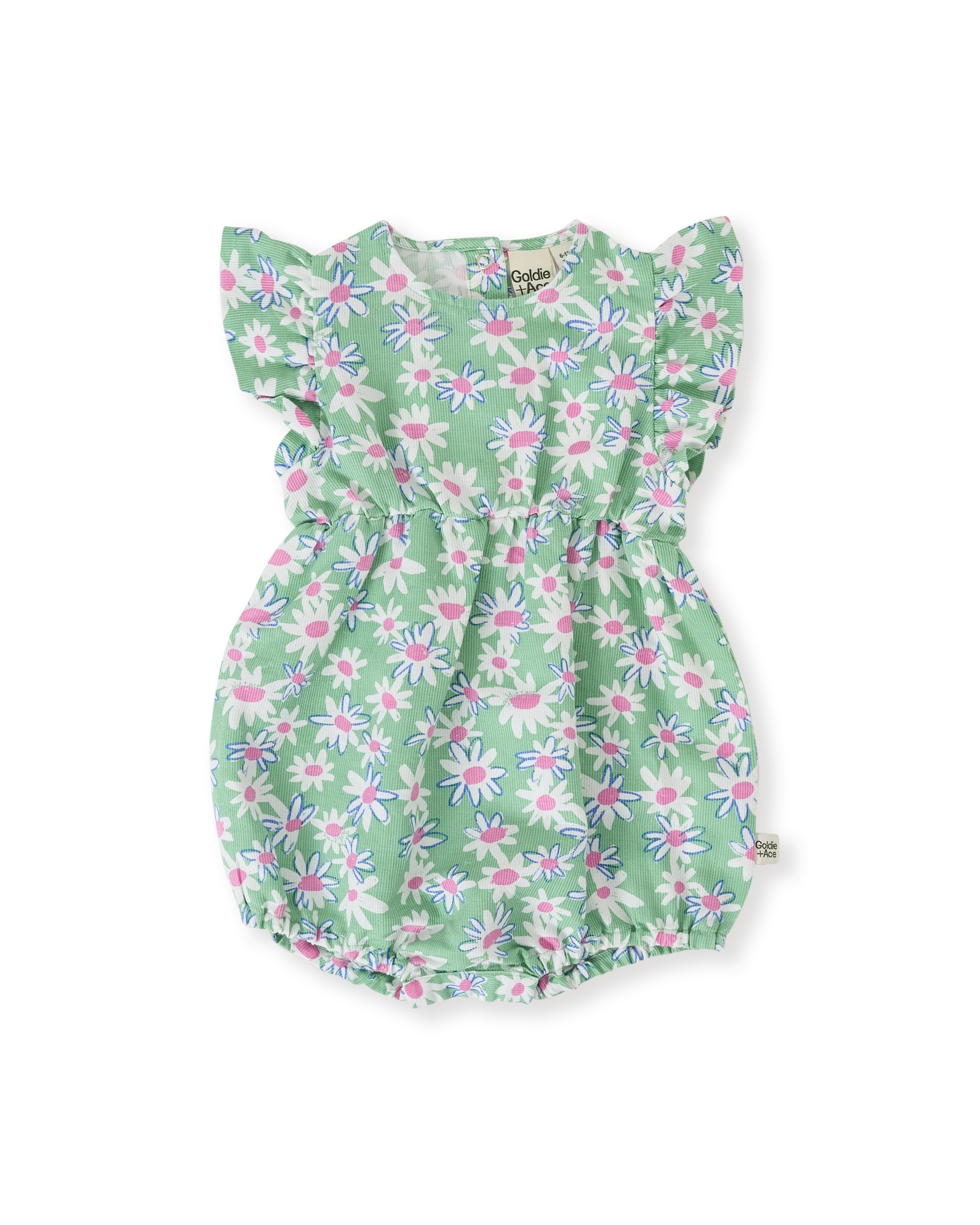 True to size. Relaxed fit. Snap buttons at nappy line and buttons on back opening for easy dressing. Features frill sleeves and a hand drawn daisy print.