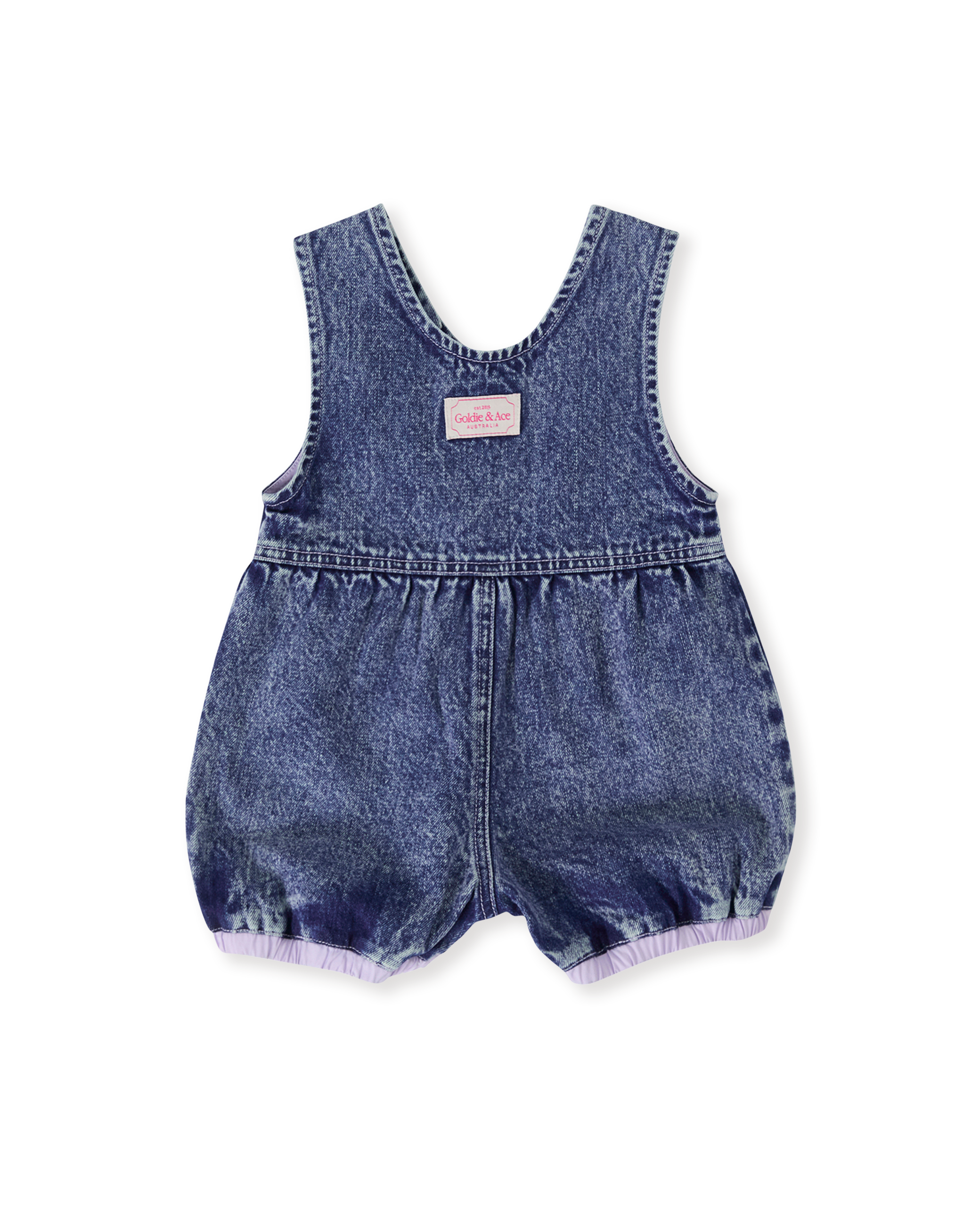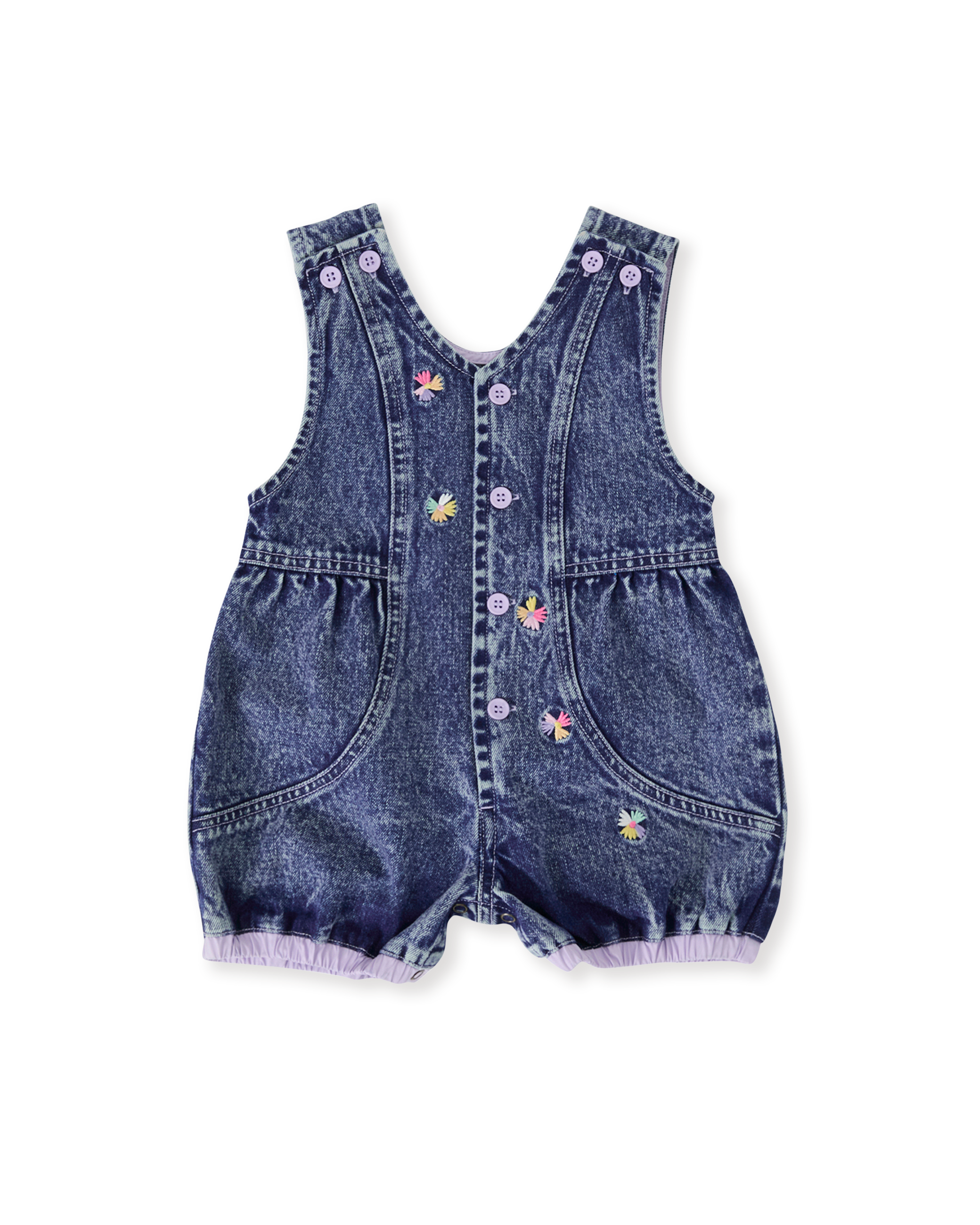True to size. Relaxed fit. Snap buttons at nappy line for easy dressing. Elasticated leg openings and adjustable straps for room to grow. Features flower embroidery detailing.