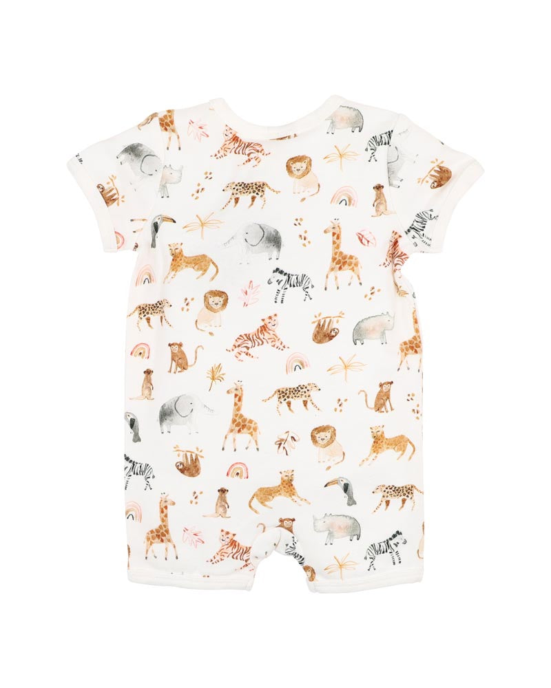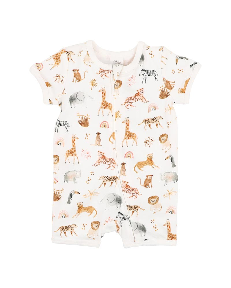 Take a walk on the wild side with our Organic Cotton Short Sleeve Romper in the enchanting Safari animal print. Crafted from soft, breathable organic cotton jersey, this romper is as comfy as it is playful-perfect for everyday adventures, nap time or tummy time. The whimsical safari-inspired print brings lions, giraffes, zebras and more to life in a palette of warm desert tones. With an easy zip front opening for fuss-free changes, this romper makes getting dressed a breeze.