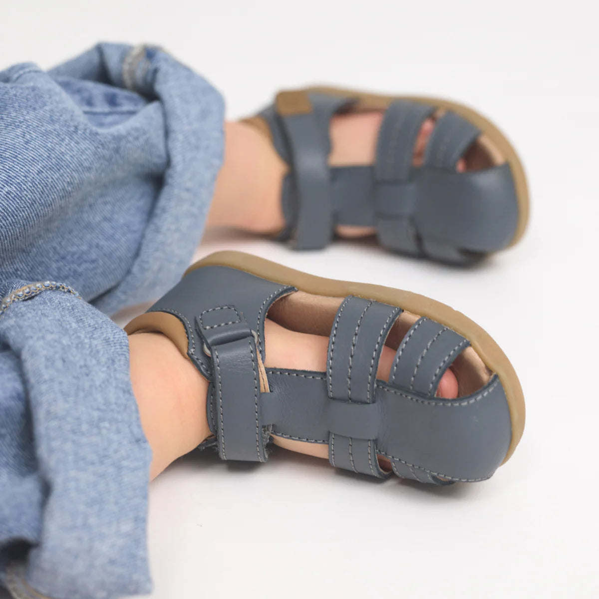 Theo features contrast detailing and heavy-weight stitching on the straps. An adjustable top strap, supportive padded heel, and closed toe make this podiatrist-approved summer sandal perfect for protecting growing feet.