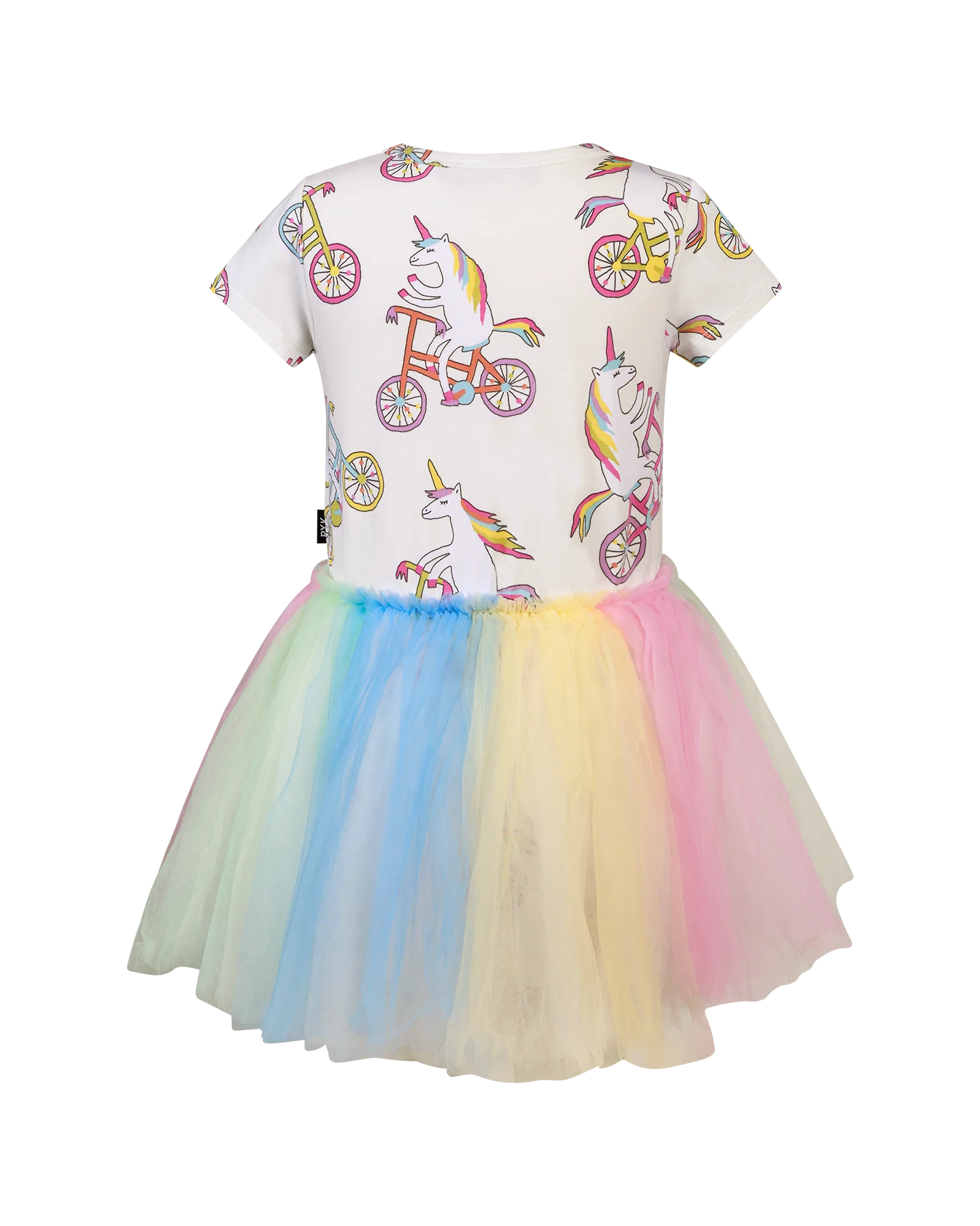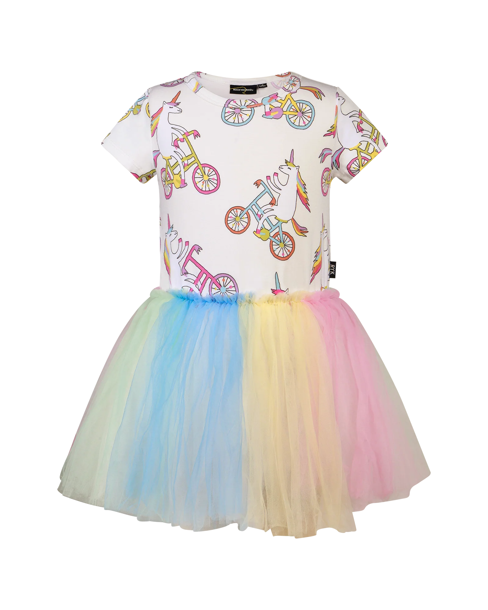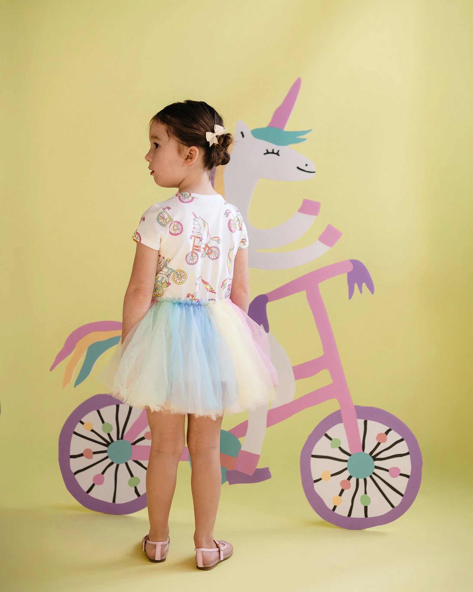 Brighten up any day with the Unicorn Bike Circus Dress! The top features a soft jersey t-shirt with an all-over unicorn bike print on a cream base, while the bottom dazzles with a rainbow tulle skirt. Perfect for twirling, playdates, or special occasions.