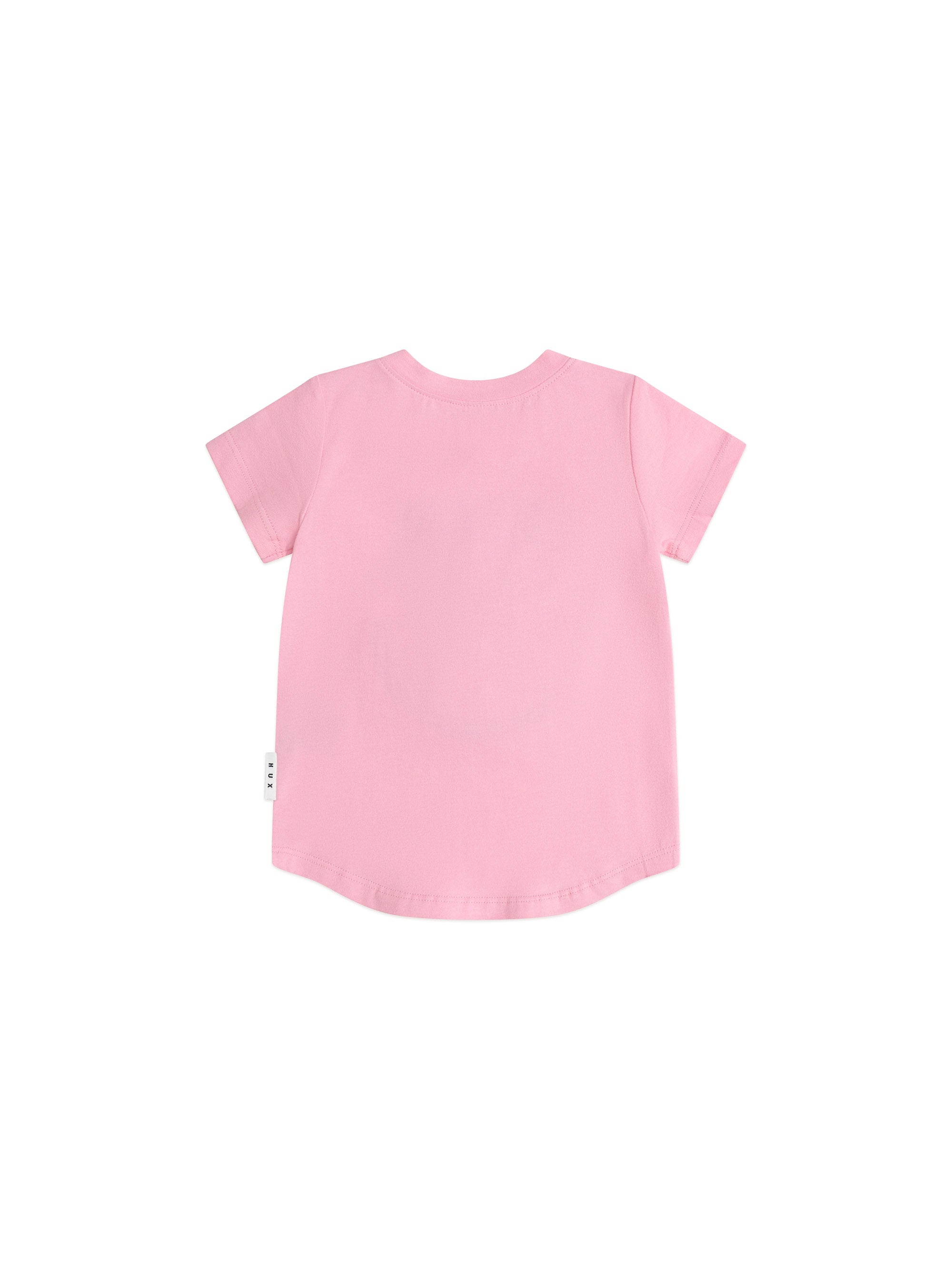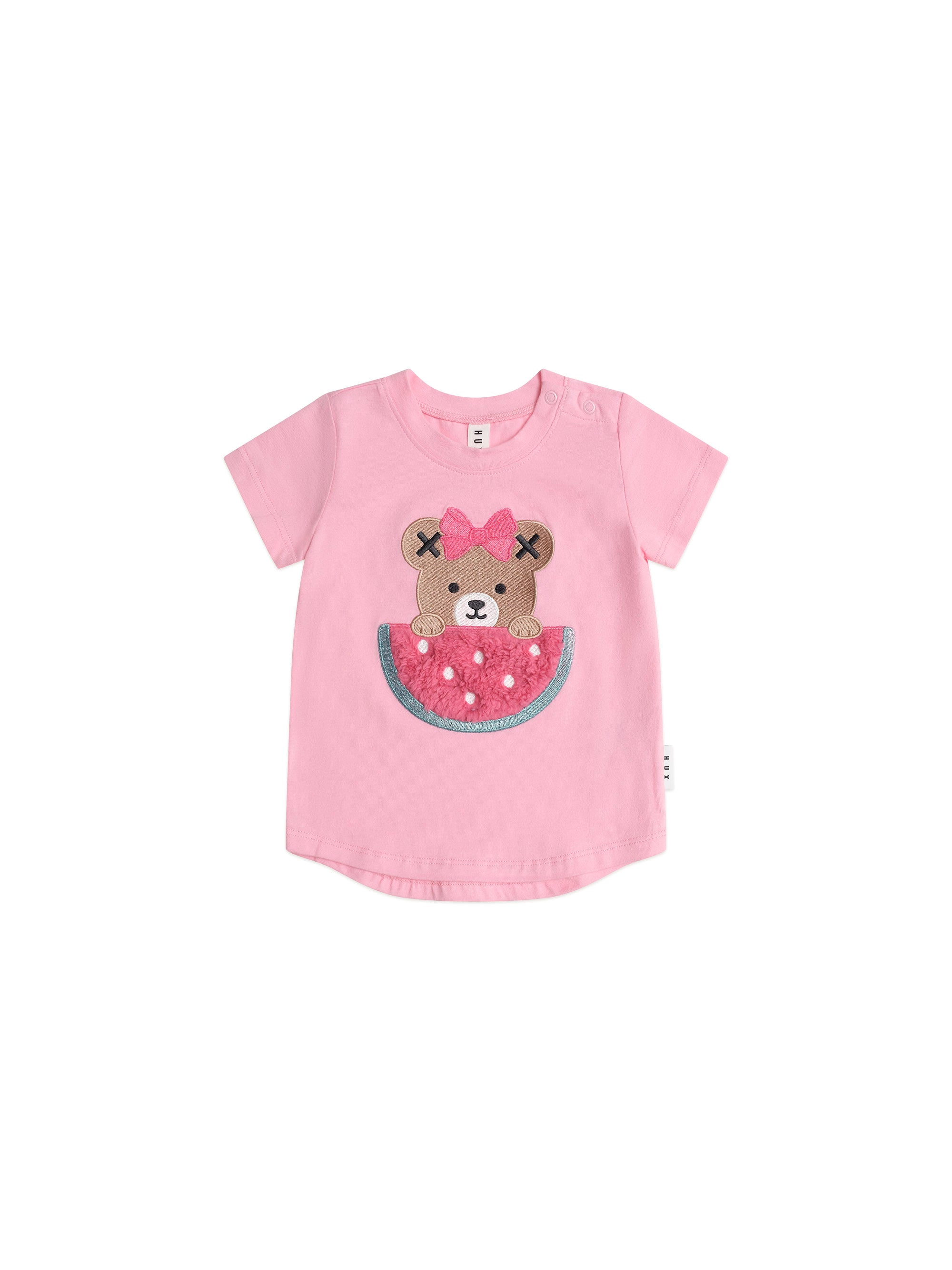 The perfect everyday tee, but with added sparkle. This round neck t-shirt is made from buttery-soft organic cotton in pretty pink and features a sparkly watermelon bear embroidery. Baby sizes feature stainless steel shoulder snaps for quick changes.