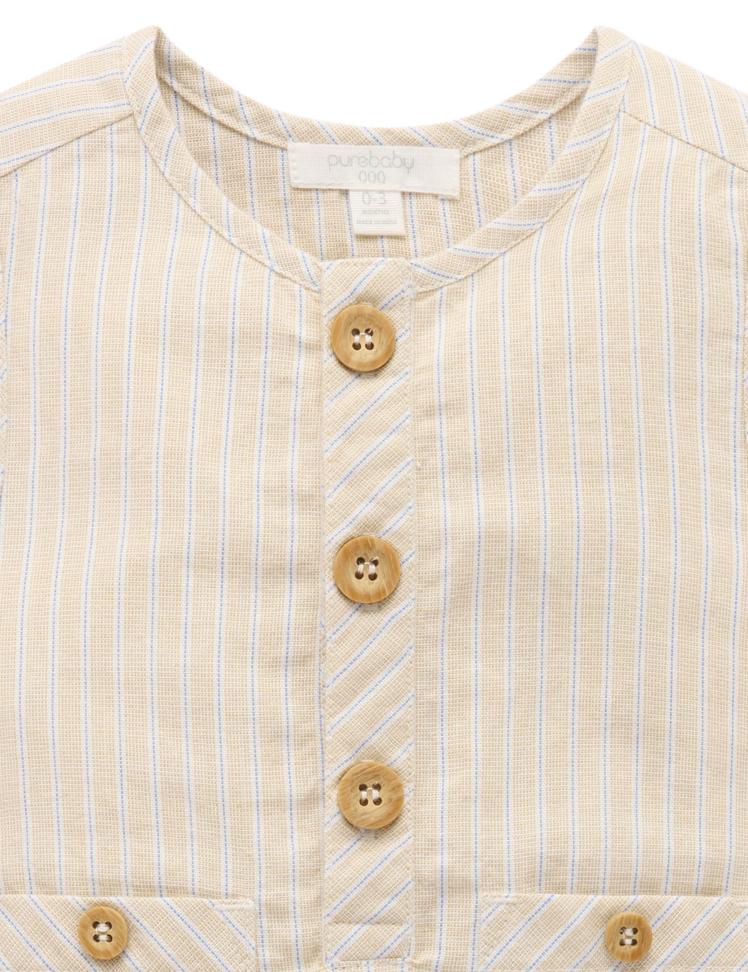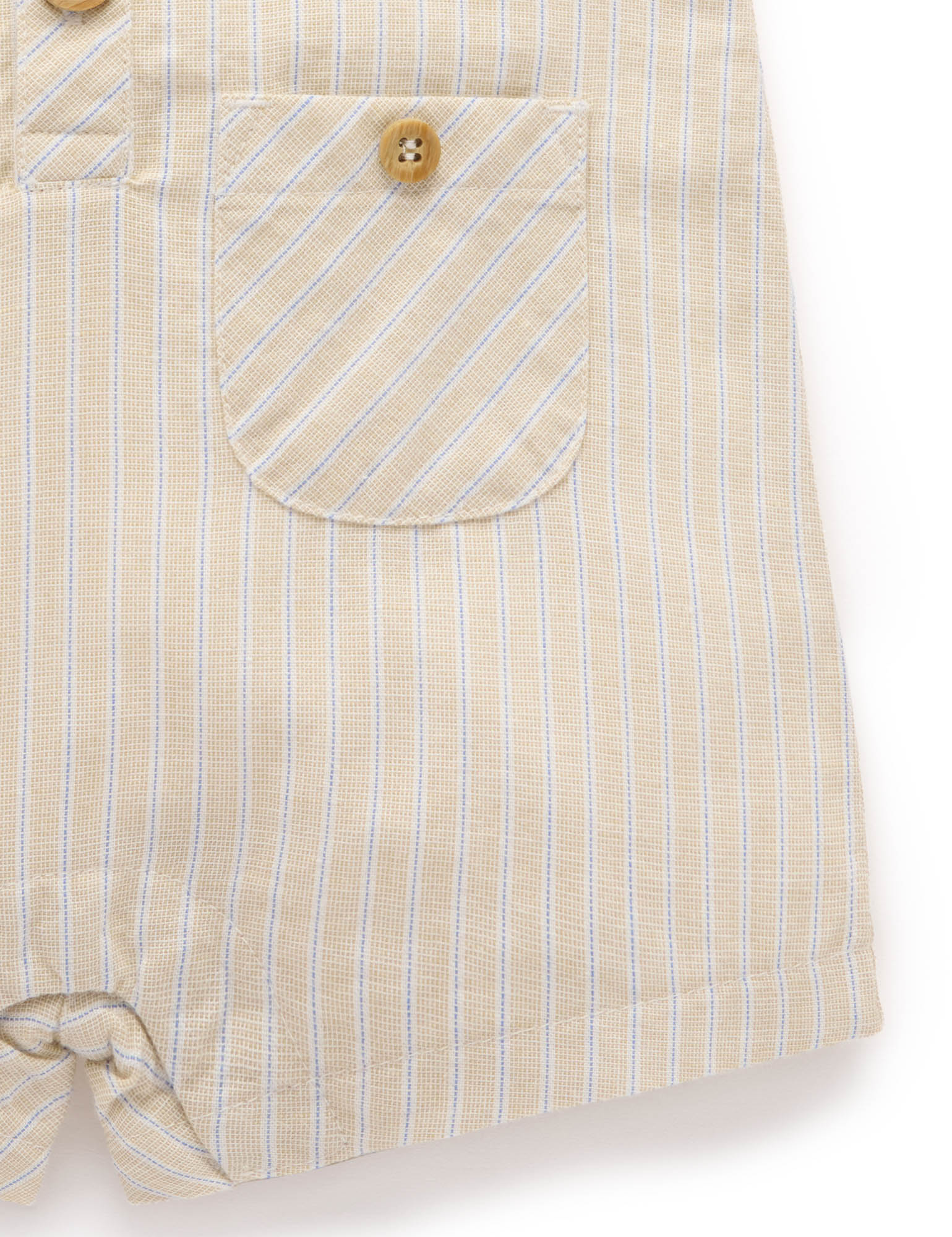 Our Linen Blend Romper is a sweet, lightweight summer style. Featuring a fine, all over stripe with a henley neckline and snap clips for easy dressing. Made from our organic cotton linen for a soft and breathable outfit. Pair with our Linen Blend Legionnaires Hat for a sweet look. Fine all over stripe Wood look buttons at the chest and pockets Snap clips at the leg for easy dressing Front patch pockets Made from 70% Organic Cotton/30% Linen