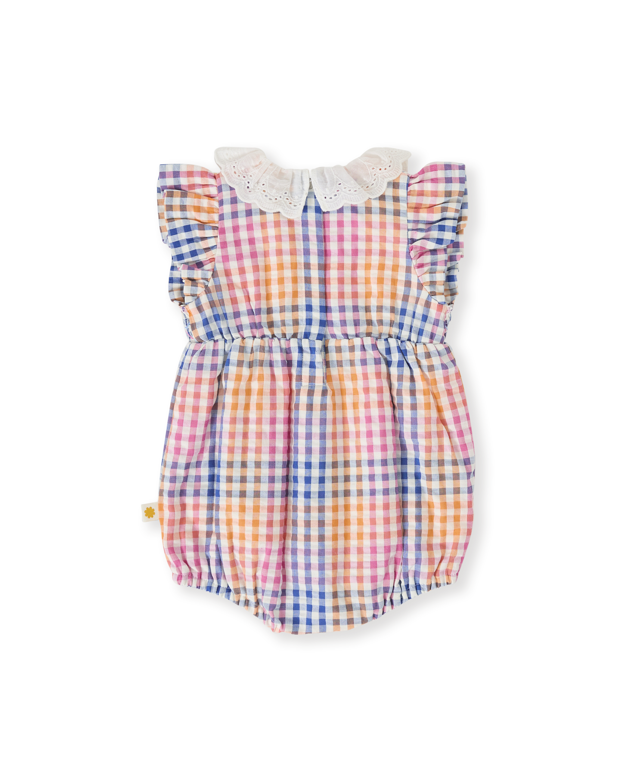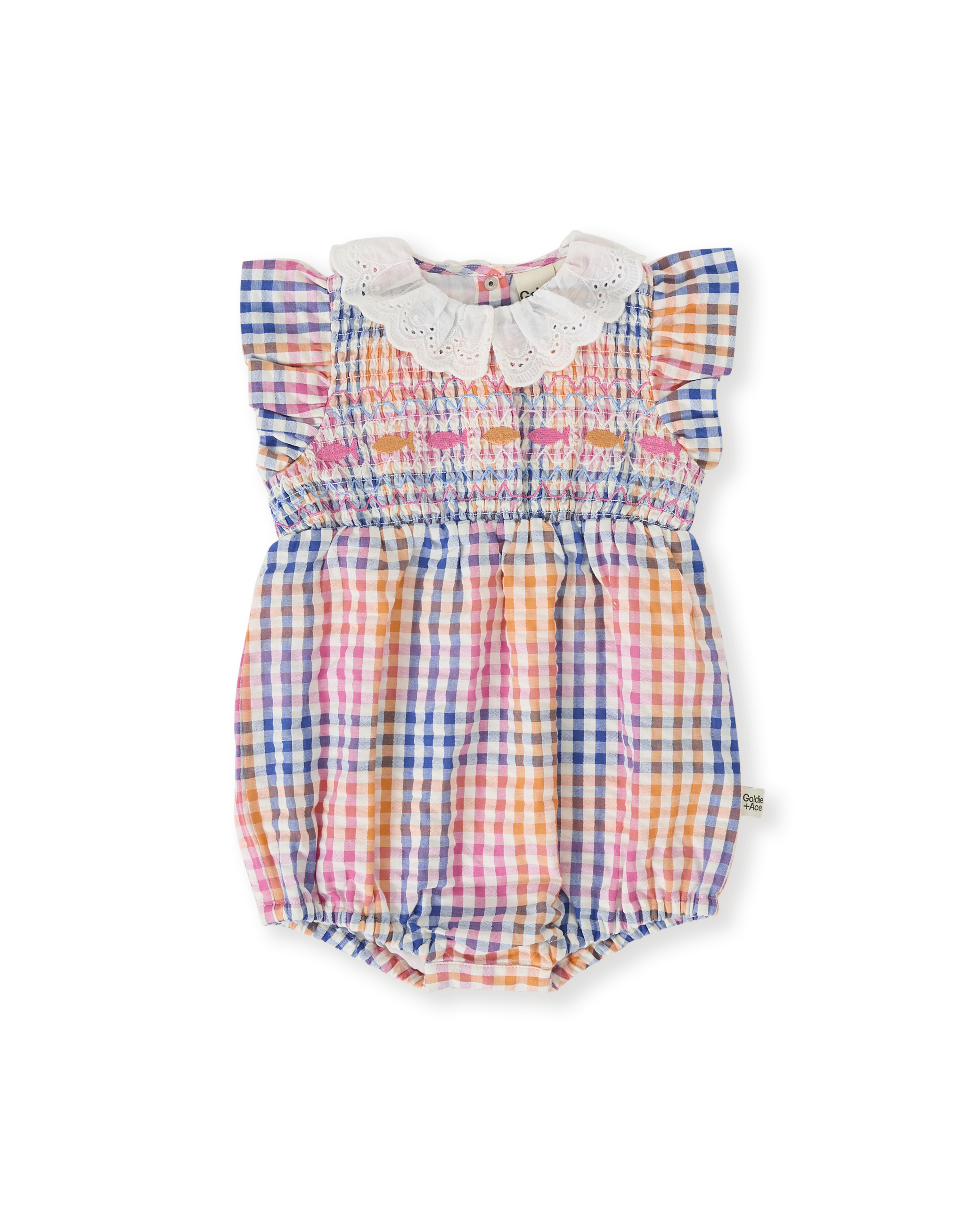 True to size. Relaxed fit. Snap buttons at nappy line and buttons on back opening for easy dressing. Features a broderie anglaise collar, embroidered smocking on the chest and frill sleeves. Elasticated around leg openings. Cotton lined. The perfect special occasion piece.