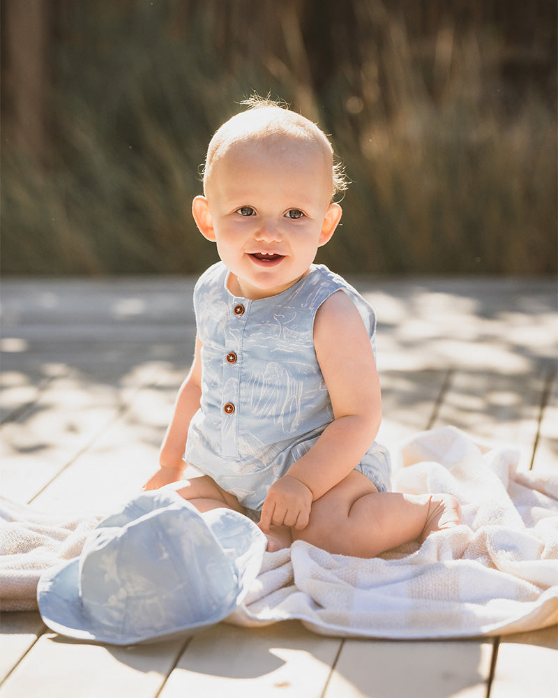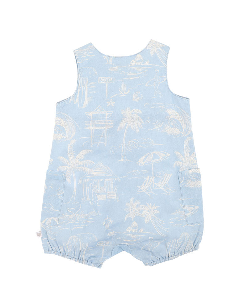 Dreaming of beach days and salty breezes? This summer-ready romper captures the charm of coastal adventures with its all-over surf print and breezy linen blend. A comfy shape, classic button details and roomy pockets make it a go-to for laidback holiday style. Match it back with the Linework sunhat for the full seaside look.