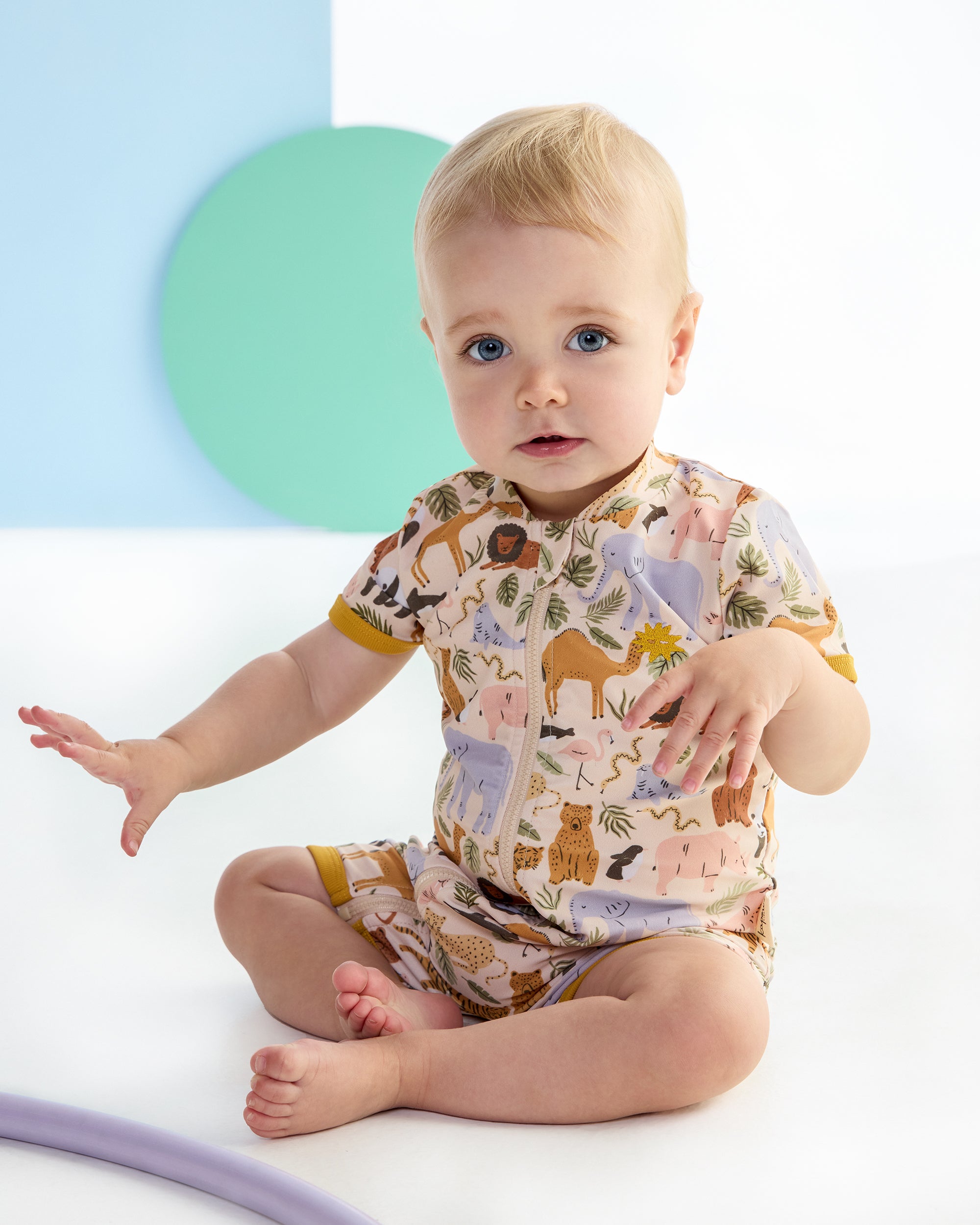 Make every splash an adventure with the Animal Kingdom Short Sleeve Swimsuit. Designed to protect with UPF50+ fabric, this playful swimsuit keeps little explorers safe from the sun while they dive into fun. Its vibrant animal-themed design sparks imagination, making pool and beach days full of joy and endless discoveries. Perfect for energetic kids who love to play and explore under the sun!