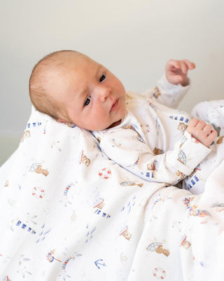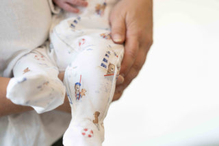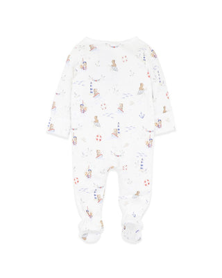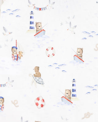 Set sail for dreamy nights and cozy cuddles in our Organic Cotton Zip Romper, featuring the charming Axel nautical print with playful bears, lighthouses, and sailboats. Designed with comfort and practicality in mind, this footed romper features a centre front zip with a protective safety fold, plus fold-over mittens to keep tiny hands warm and prevent scratching. Crafted from soft, breathable Organic Cotton, it's perfect for sleep or play. Match it back with the Axel blanket for a coordinated gift.