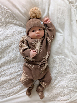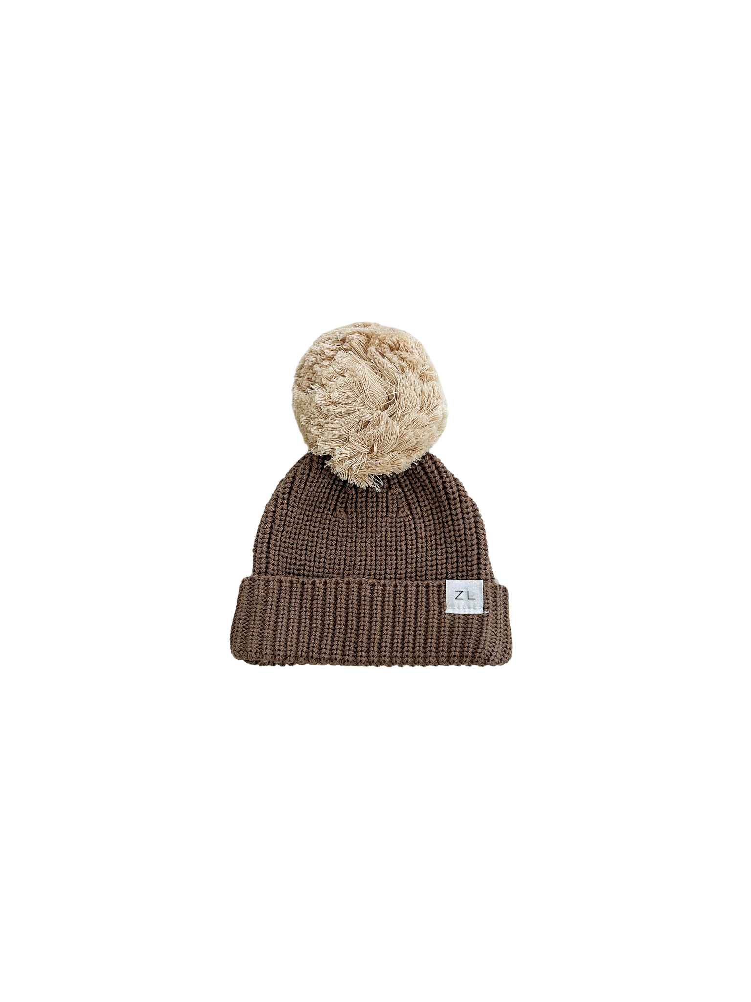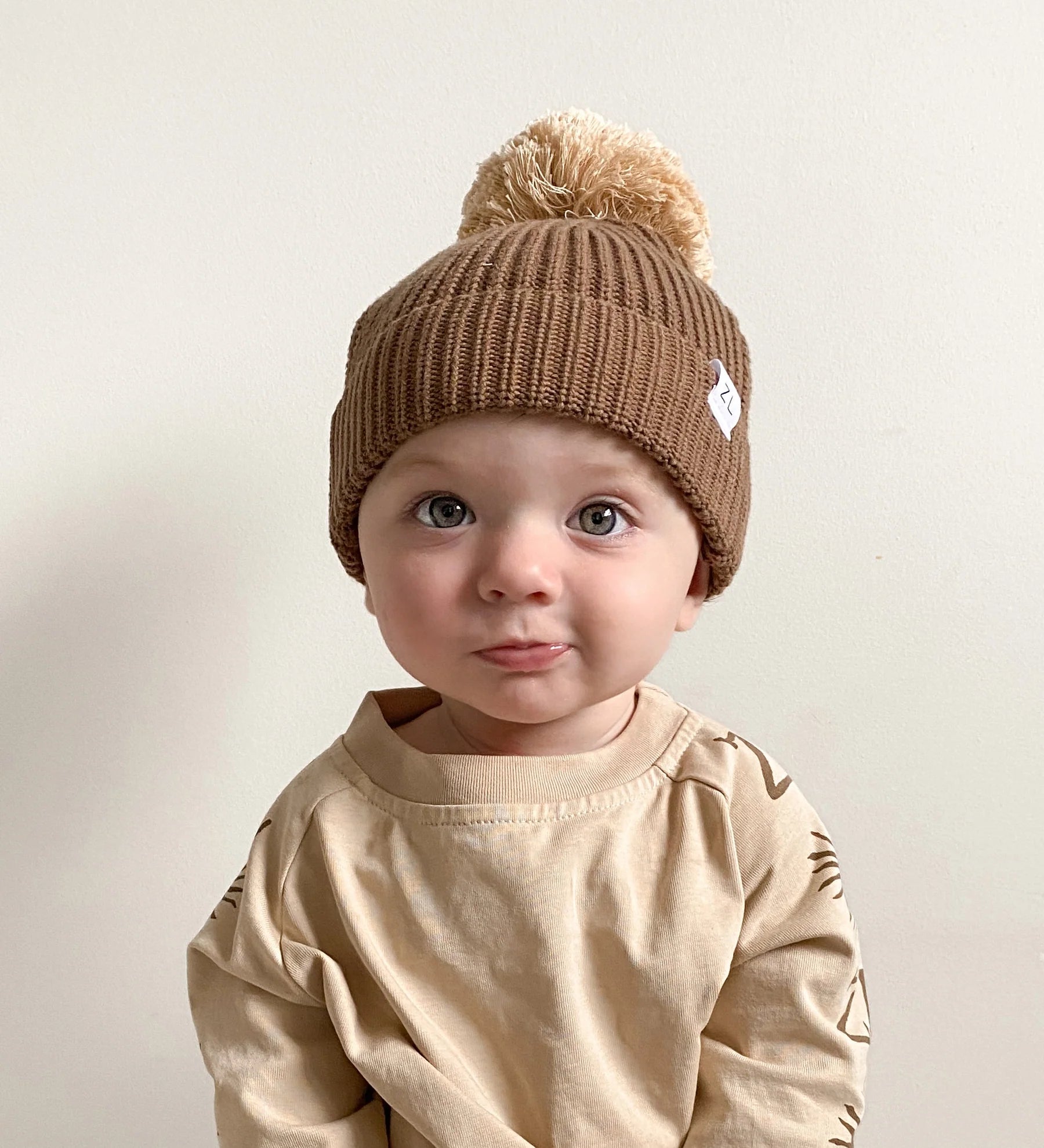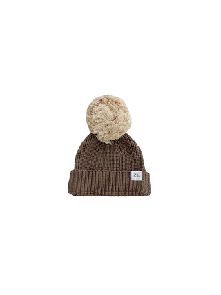 Beautiful chunky knit beanie with frappe coloured pom pom. This beanie compliments our Cyrus Collection.