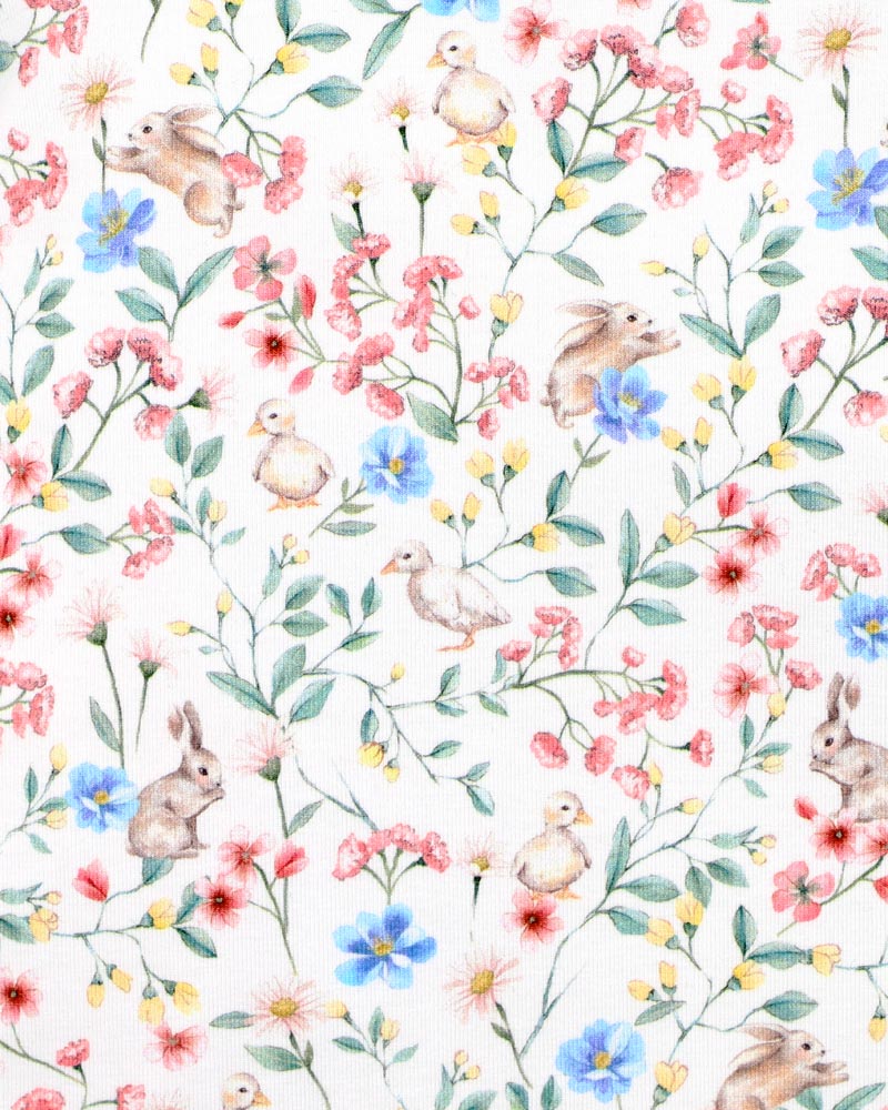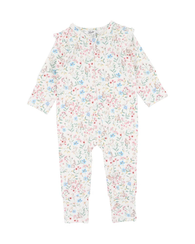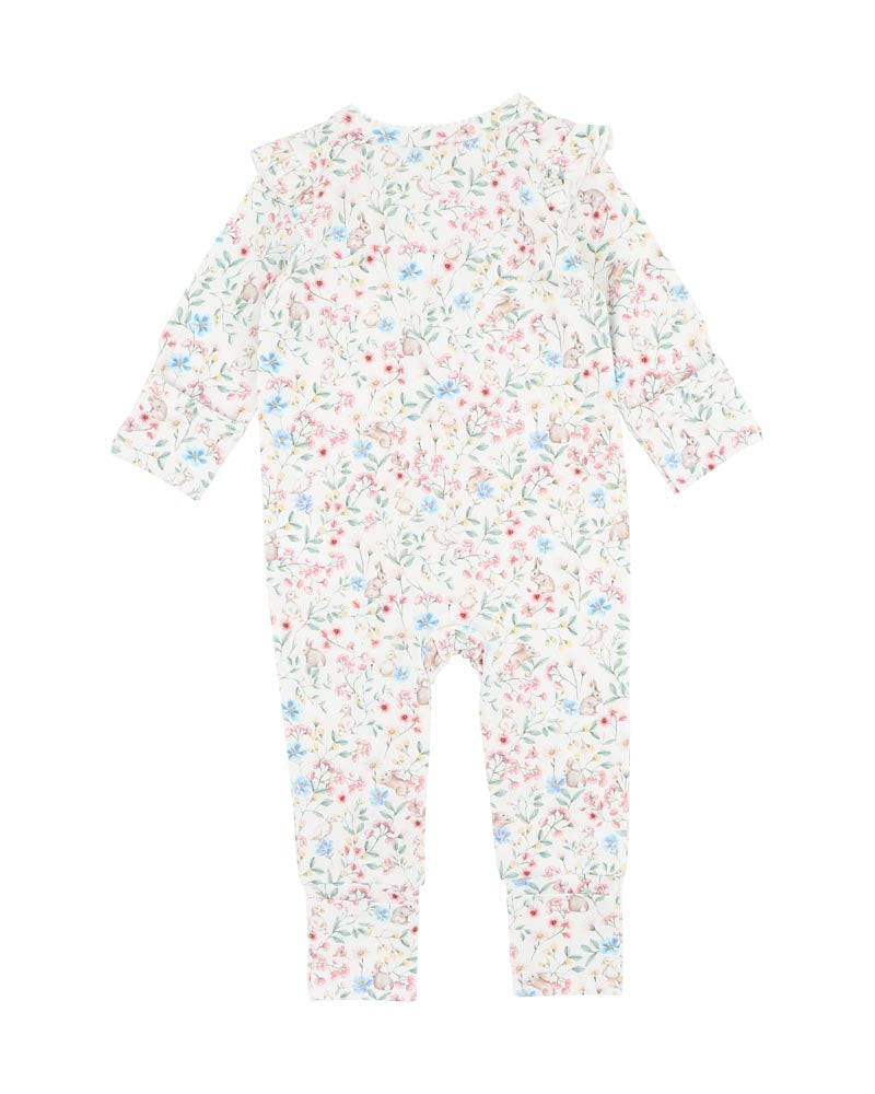 Wrap your little one in whimsical comfort with this Organic Cotton blend bunny and floral print zip romper, perfect for everyday adventures and sweet slumbers. Designed with practicality in mind, it features a two-way zip for easy changes and a soft safety fold at the neckline to protect delicate skin. Frill detailing at the shoulders and a dainty picot trim at the neckline add a feminine charm, while fold-over cuffs at the hands and feet offer added warmth and versatility. Perfect for everyday wear or cosy cuddles.