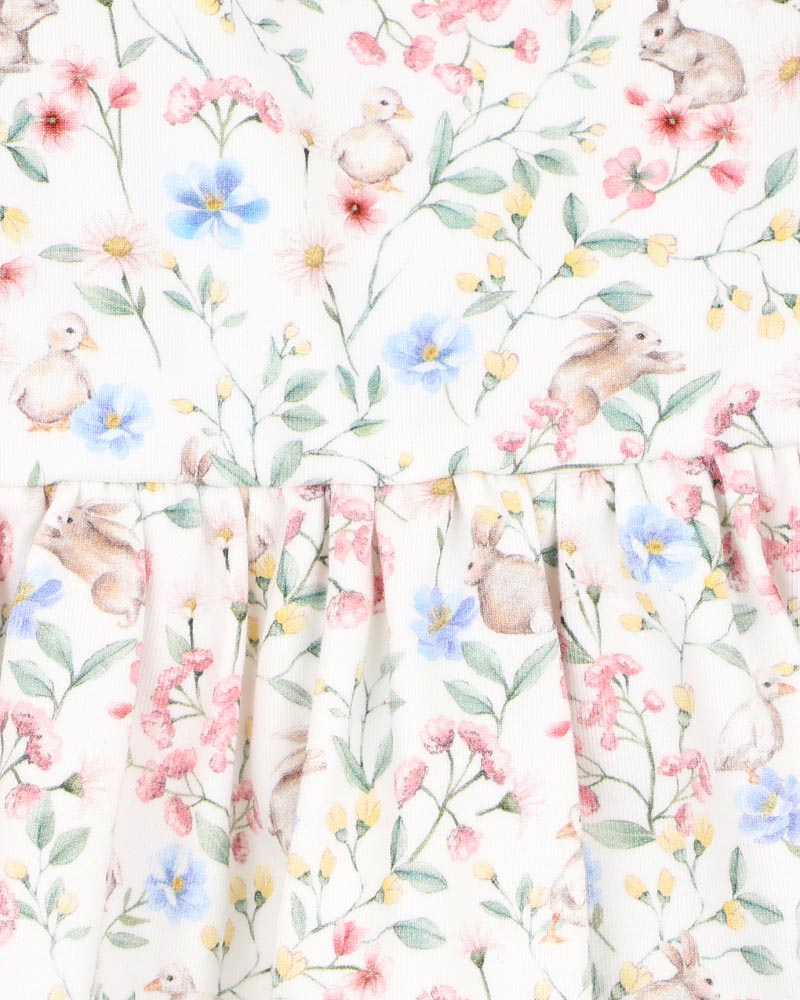 Bring a touch of whimsy to your little one's wardrobe with this delightful floral overlay dress. Designed with an all-in-one style for easy dressing, this piece features a beautifully gathered skirt in an all-over bunny and wildflower print, flutter sleeves, and a built-in bodysuit for comfort and practicality. Crafted from soft, breathable 95% organic cotton and 5% elastane for gentle stretch, it's perfect for warm-weather adventures and special days alike.