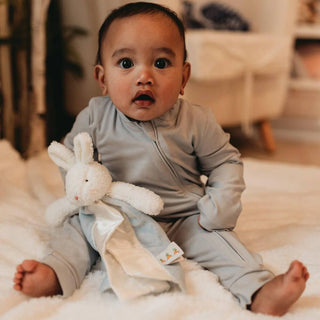 Perfect for home or on-the-go, this beautifully crafted Blue Bunny Bye Bye Buddy is a plush toy and comfort blanket in one. Featuring the softest baby-safe plush fabrics, this Bye Bye Buddy also includes a handy loop which easily attaches to baby's cot, pram or car seat for maximum play and comfort value. An exquisite split blanket complete with satin trim and lining makes this an extra-special security blanket for your little one to love.