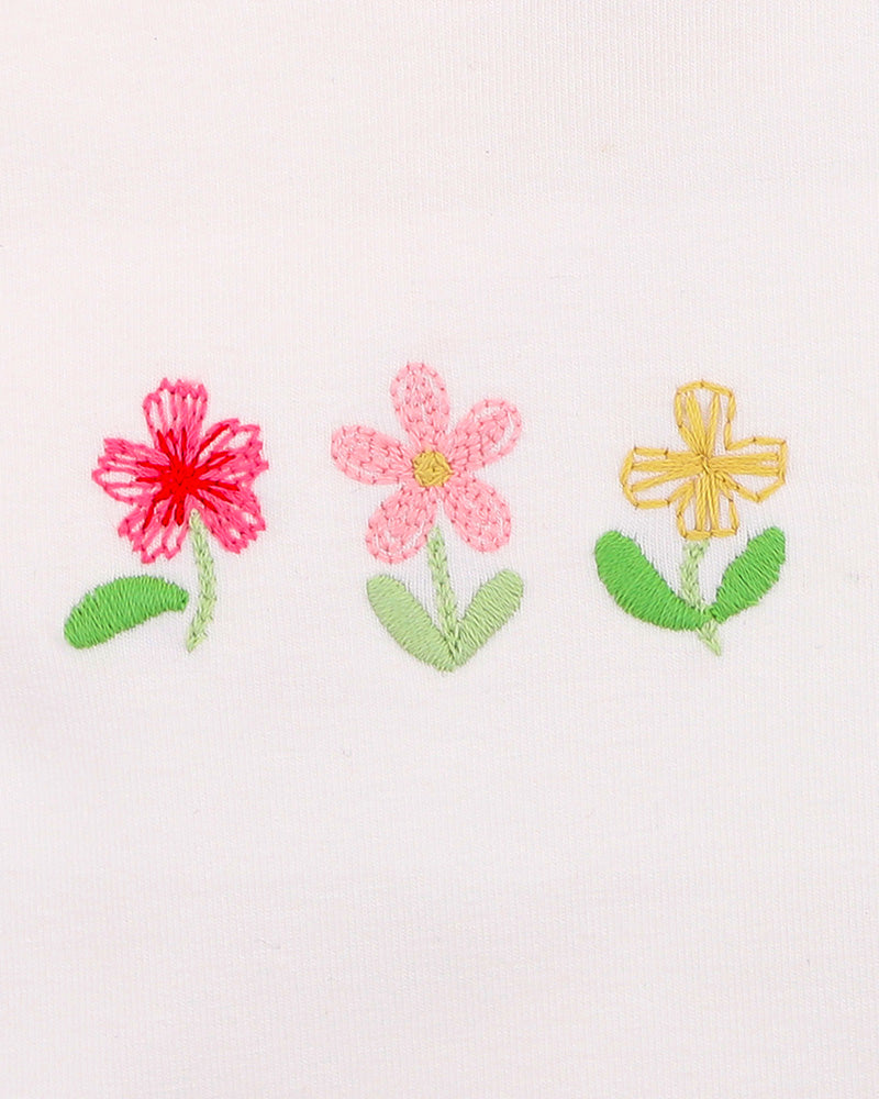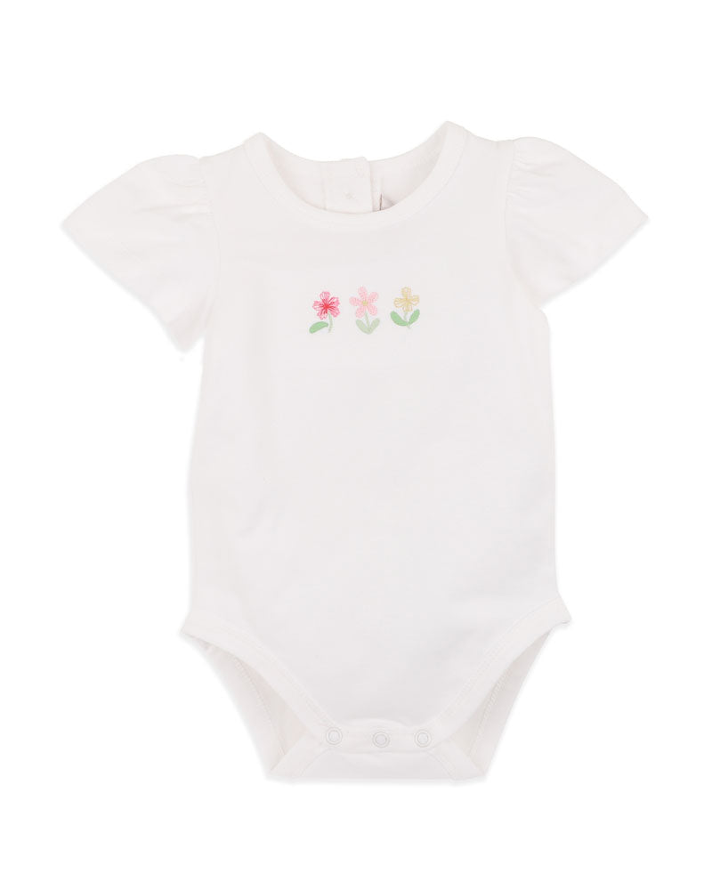 A little garden of blooms for your baby girl. This soft puff-sleeve bodysuit is adorned with three delicate embroidered flowers, adding a charming touch to a classic silhouette. Perfect for pairing with her Grow Wild bloomers or worn as a standalone outfit on warmer days.