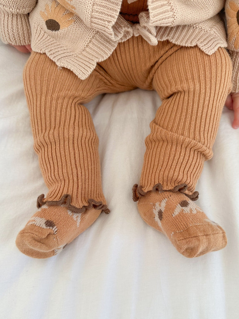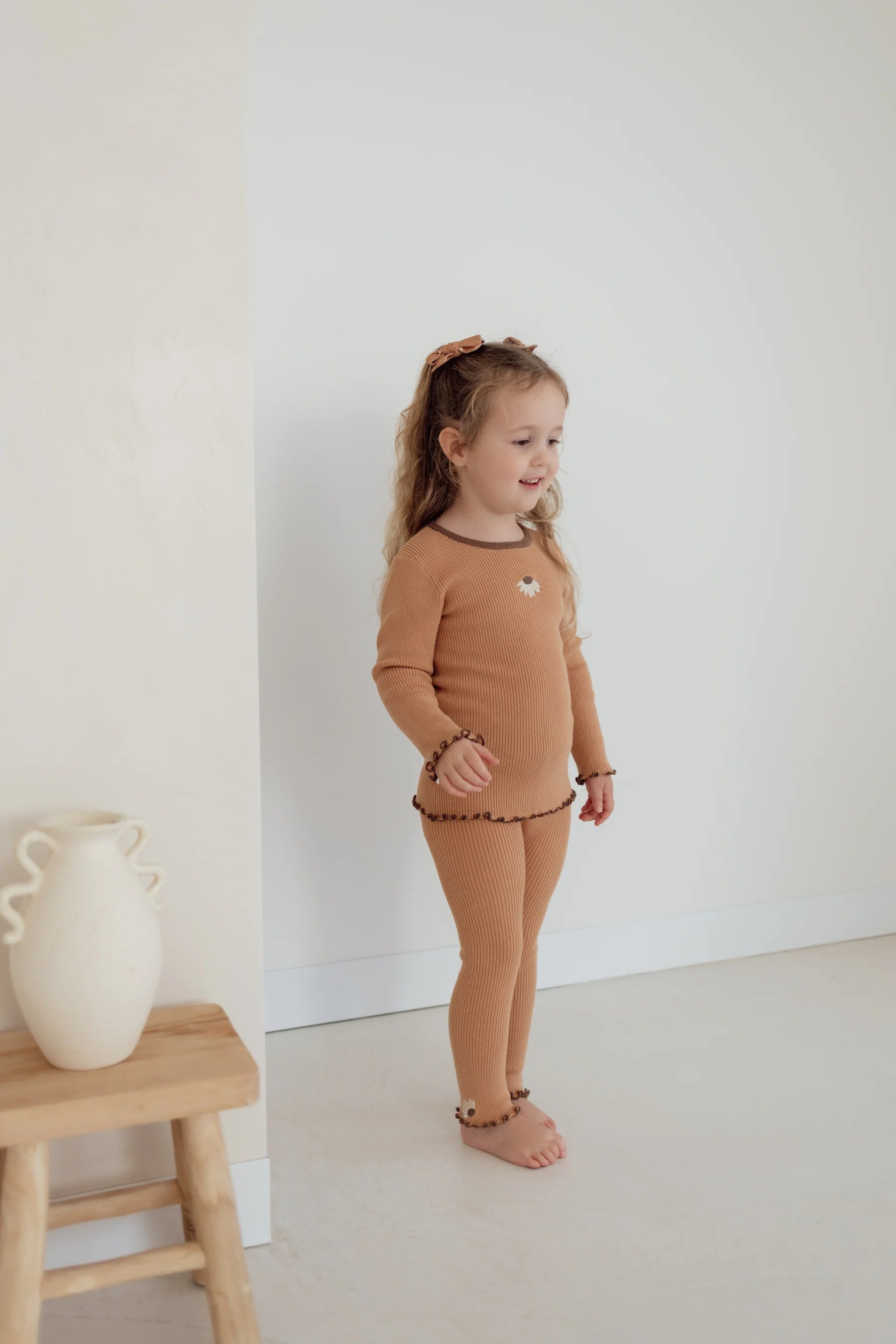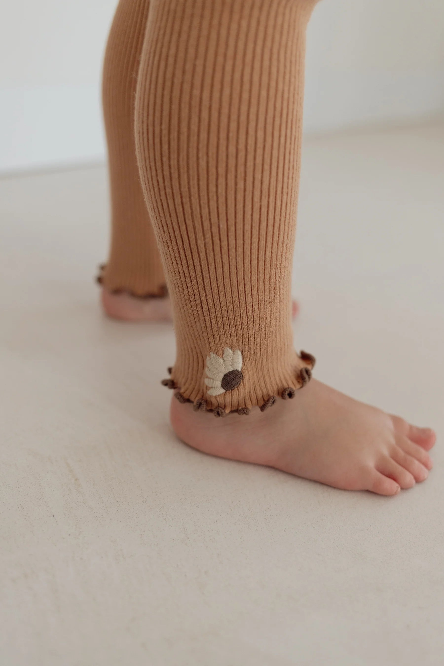 Knitted ribbed leggings in our Dulce colour, featuring an embroidered Hazel flower on each ankle. Mix and match with our Hazel + Cyrus Collections.