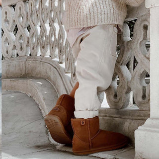 Comfortable and functional, the original Wallaby Mini suede boot for children is a classic year round ankle-height boot. Made with luxury natural suede and cosy Australian Merino wool, this cute and classic boot for kids ensures warmth and comfort for little toes. But it’s also ideal for wearing in warmer summer weather, since our natural materials are really breathable, meaning it keeps children’s feet cool and dry. And since these boots easily slip on and off, they’re ideal for getting the kids dressed on busy mornings, and great for travelling. A dual density outsole, with extra cushion EVA, provides optimum traction and grip whilst the moulded heel provides a superior fit and comfort. The materials used in the creation of the Wallaby Mini boot for kids are natural and also Woolmark accredited.